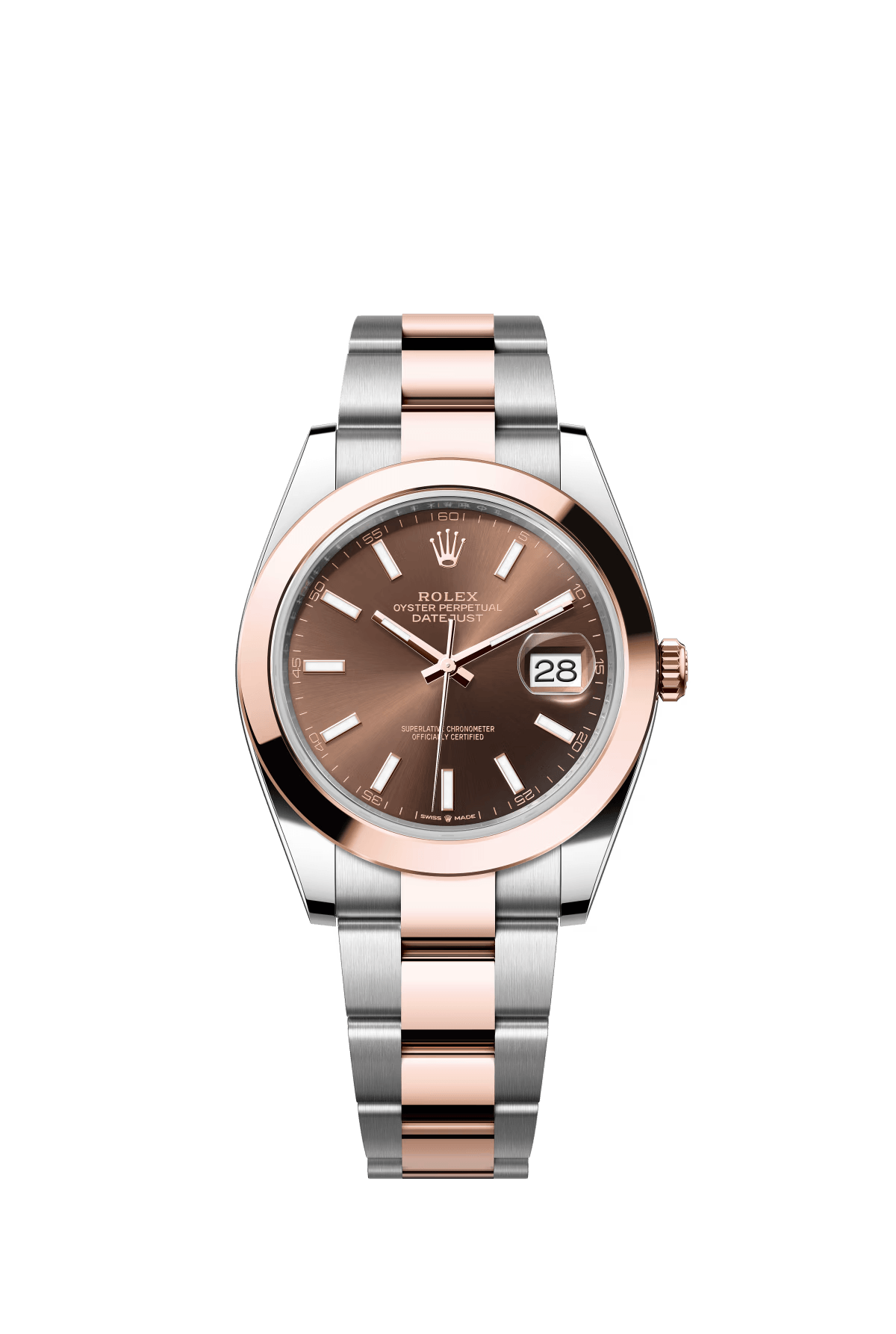 The Oyster Perpetual Datejust 41 is available in Everose gold and Oystersteel with a chocolate-coloured dial and an Oyster bracelet. -m126301-0001