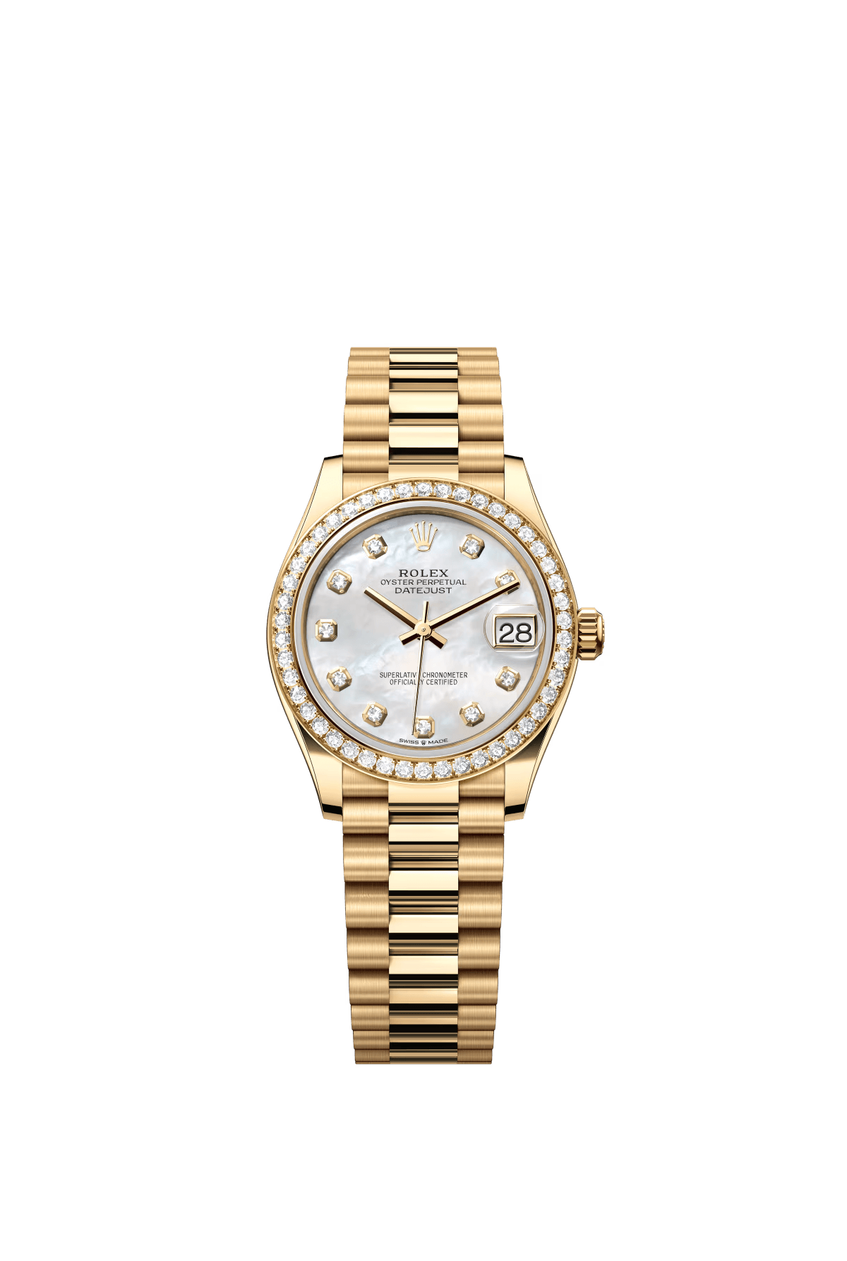 The Oyster Perpetual Datejust 31 in 18 ct yellow gold with a diamond-set white mother-of-pearl dial and a President bracelet. -m278288rbr-0006