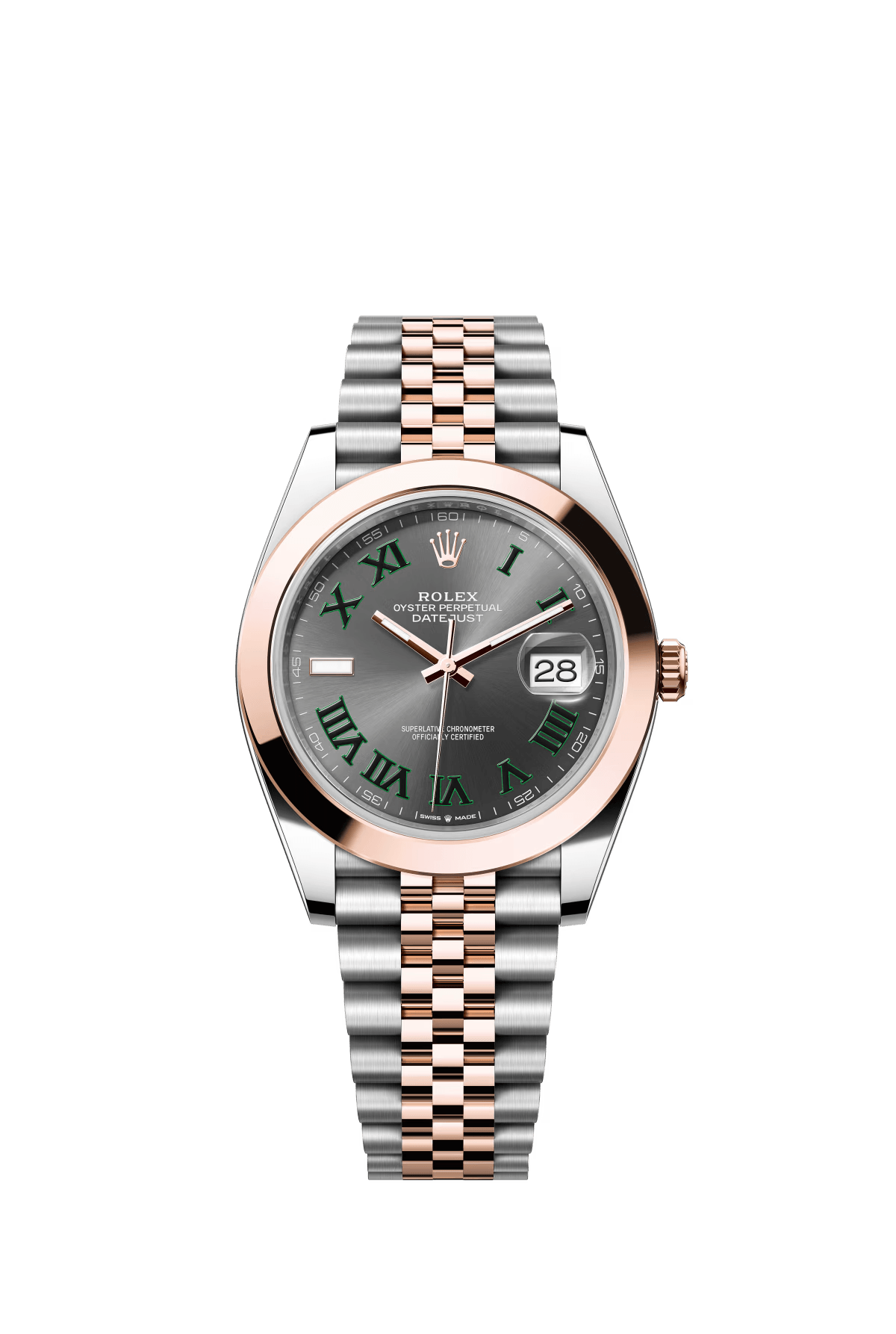 The Oyster Perpetual Datejust 41 is available in Everose gold and Oystersteel with a slate-grey dial and a Jubilee bracelet. -m126301-0016