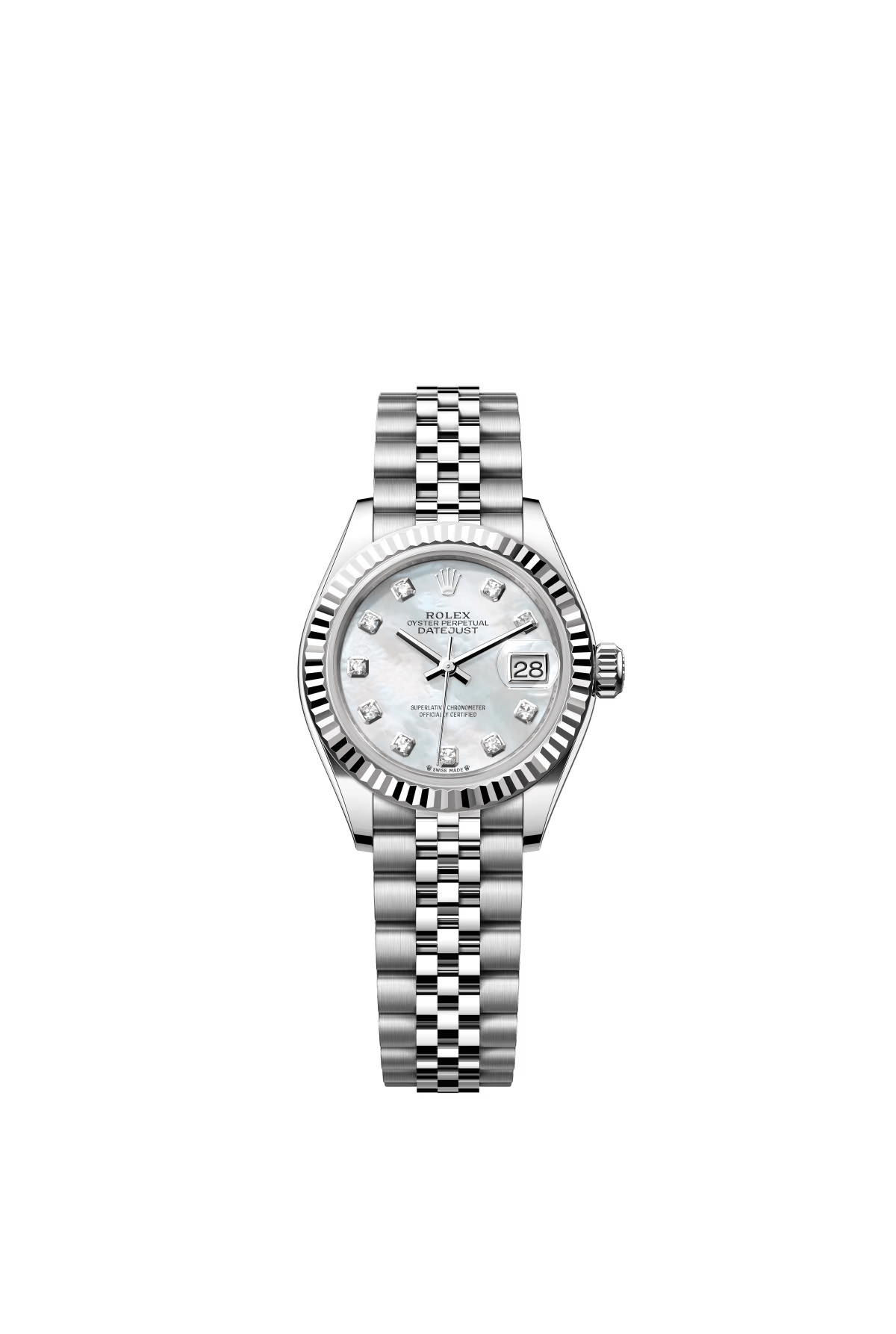 The Oyster Perpetual Lady-Datejust in white gold and Oystersteel with a diamond-set white mother-of-pearl dial and a Jubilee bracelet. -m279174-0009 28mm