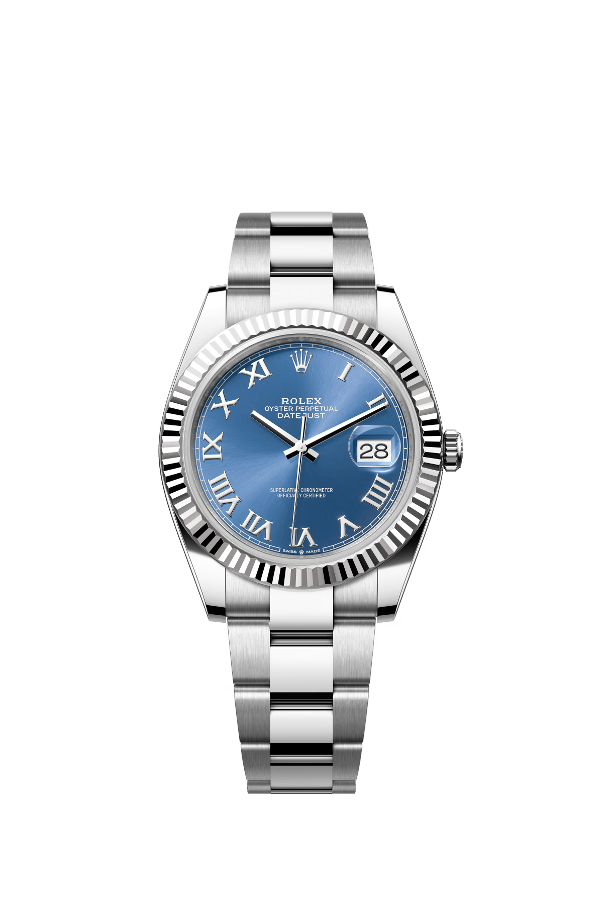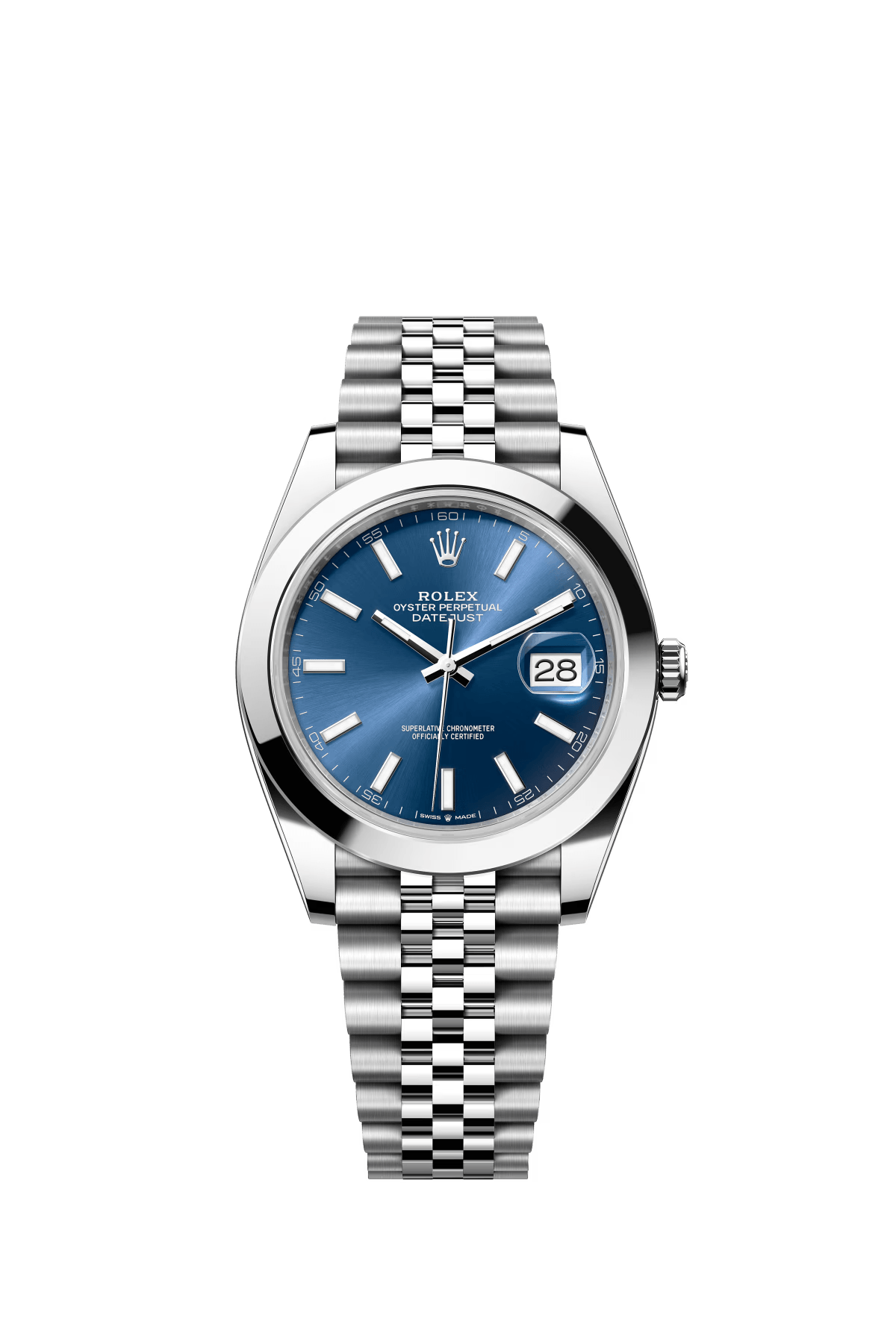 The Oyster Perpetual Datejust 41 is available in Oystersteel with a bright blue dial and a Jubilee bracelet. -m126300-0002