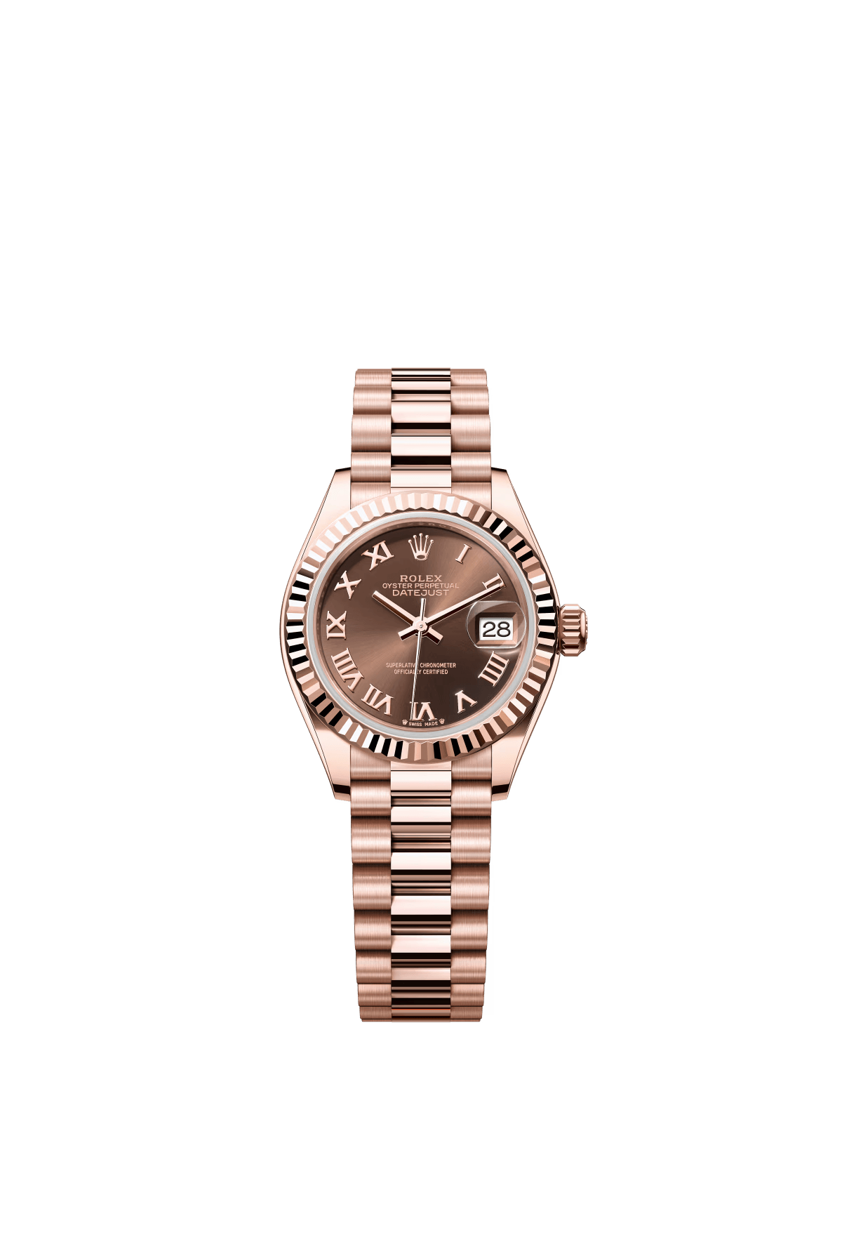 The Oyster Perpetual Lady-Datejust in 18-carat Everose gold with a chocolate-coloured dial and President bracelet. -m279175-0014 28mm