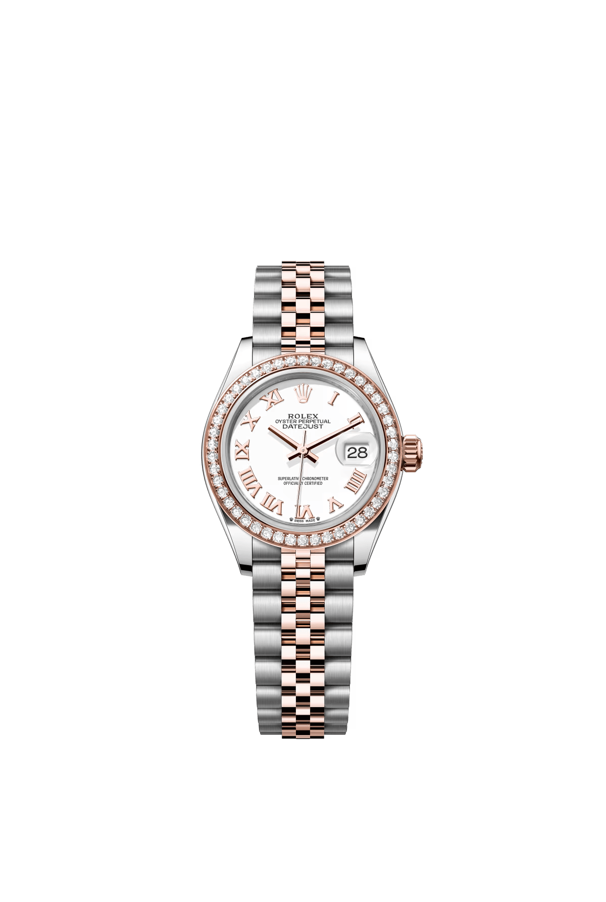 The Oyster Perpetual Lady-Datejust is available in Everose gold and Oystersteel with a white dial and a Jubilee bracelet. -m279381rbr-0021 28mm