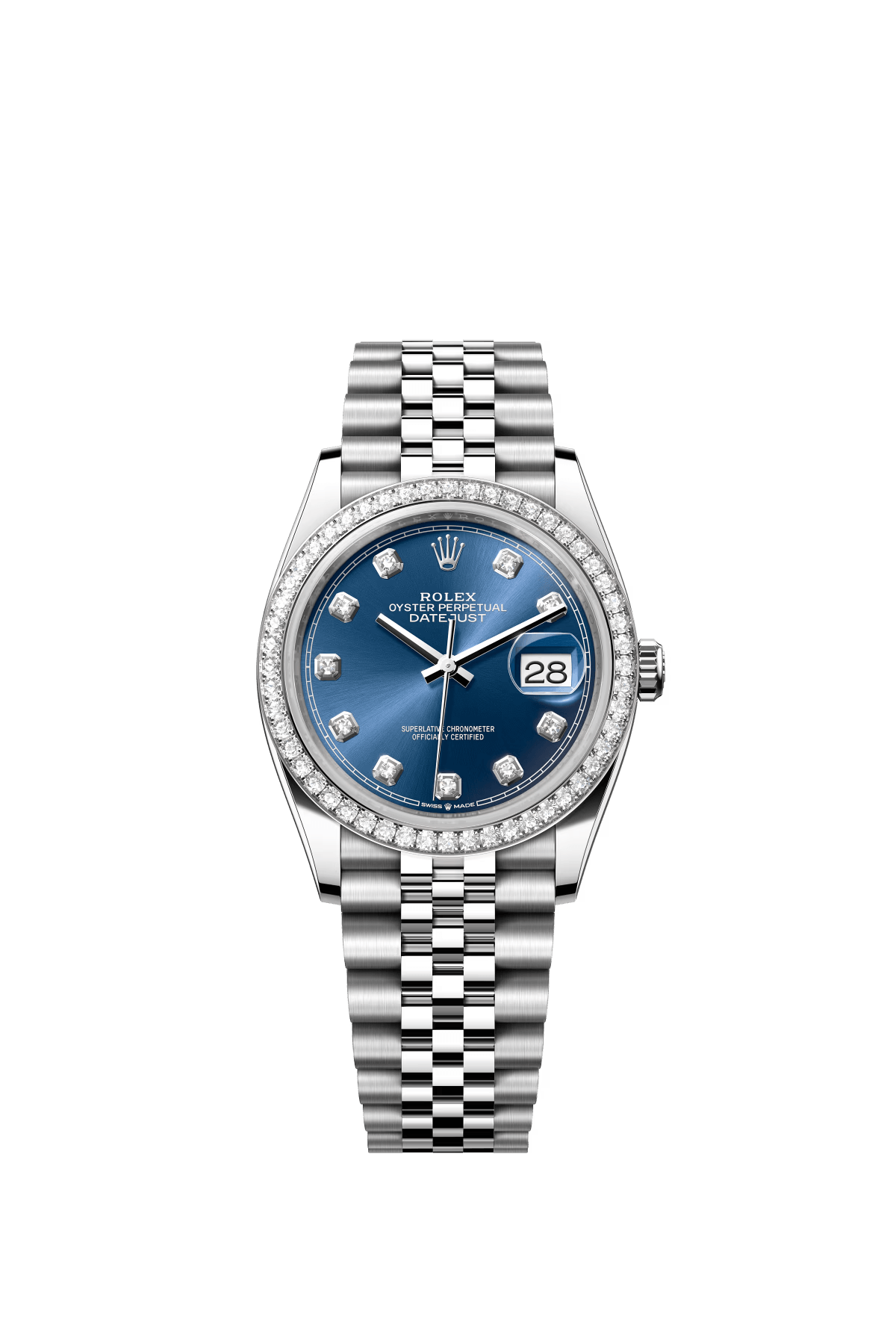 The Oyster Perpetual Datejust 36 is available in white gold and Oystersteel. with a brilliant blue diamond-set dial and a Jubilee bracelet. -m126284rbr-0029