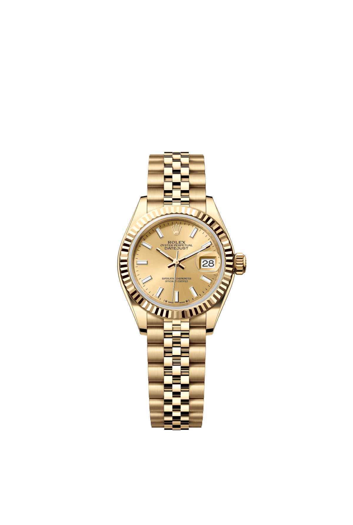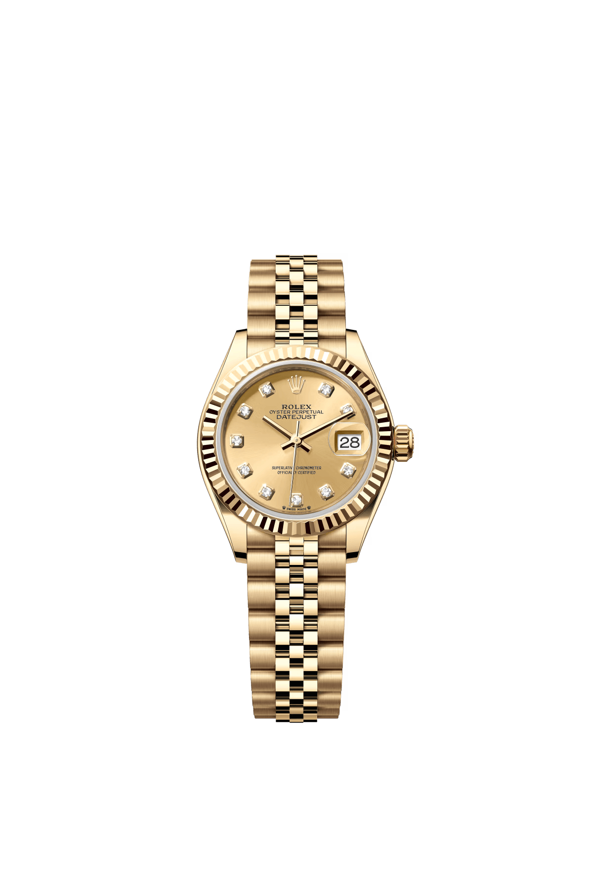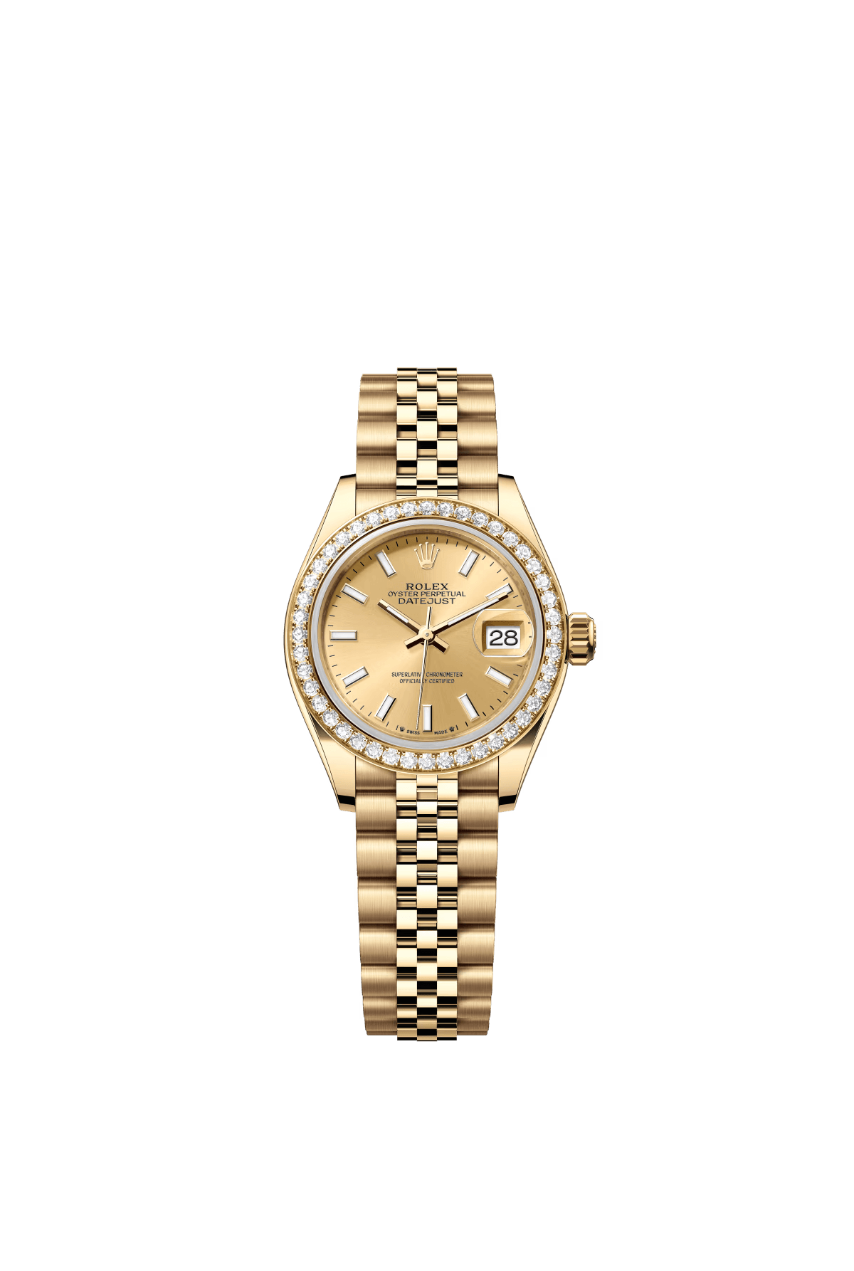 The Oyster Perpetual Lady-Datejust in 18 ct yellow gold with a diamond-set champagne dial and a Jubilee bracelet. -m279178-0024 28mm