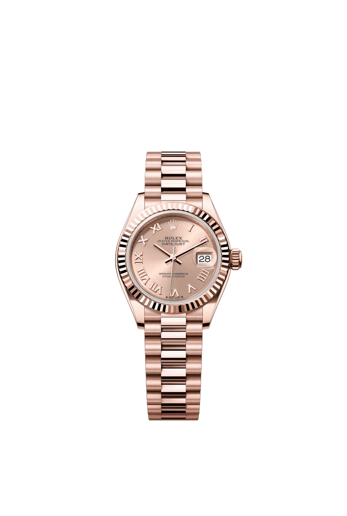 The Oyster Perpetual Lady-Datejust in 18-carat Everose gold with a rose gold-tone dial and President bracelet. -m279175-0027 28mm