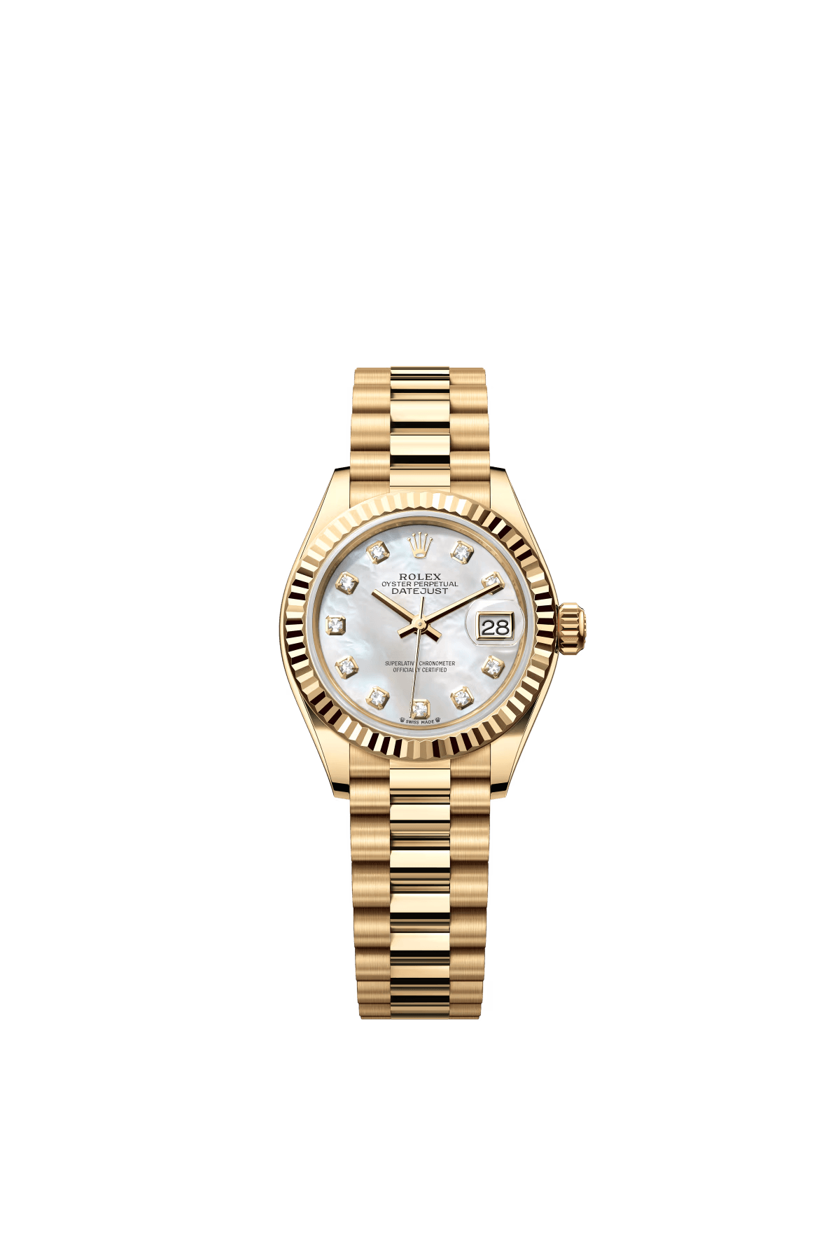 The Oyster Perpetual Lady-Datejust in 18 ct yellow gold with a diamond-set white mother-of-pearl dial and a President bracelet. -m279178-0025 28mm