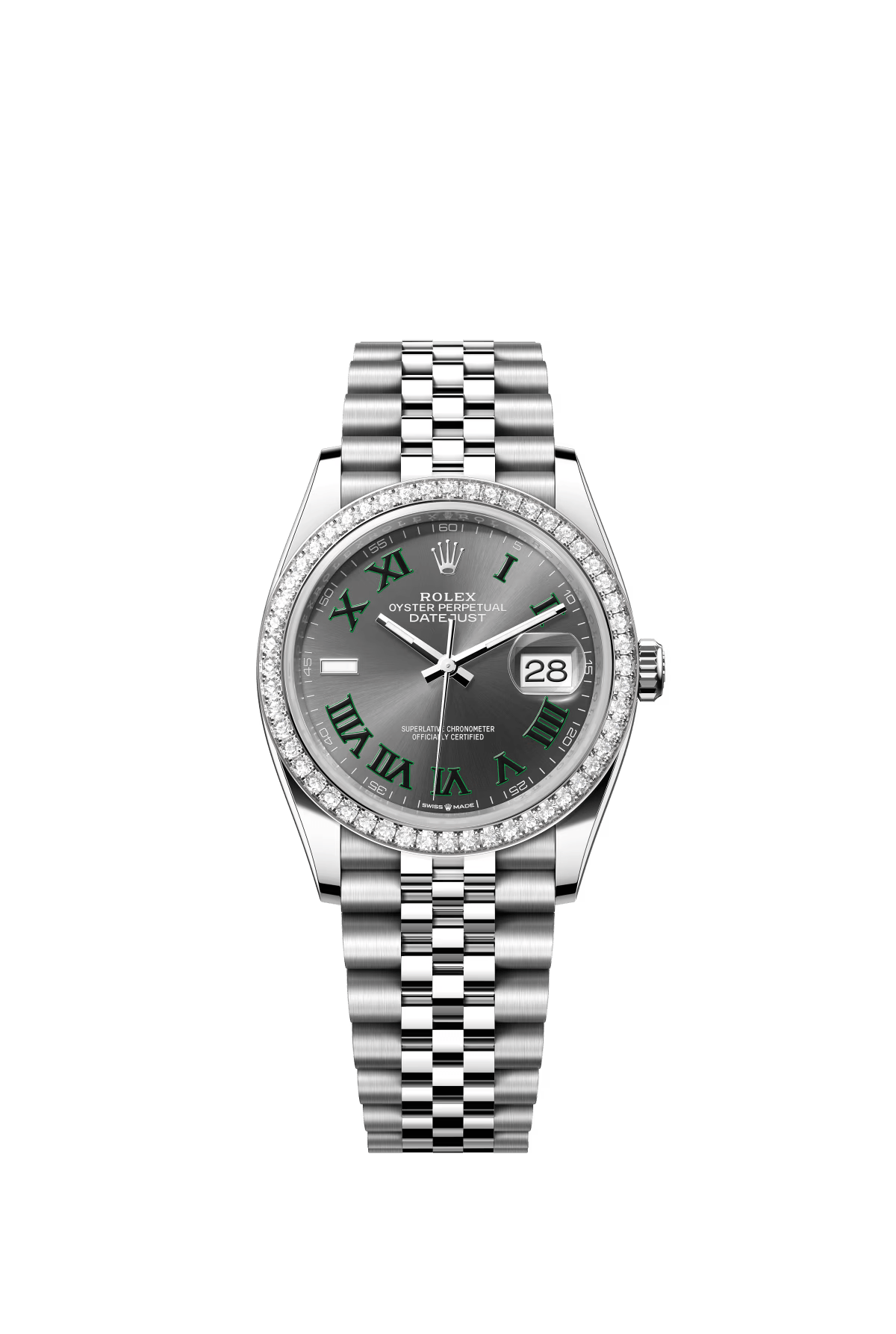 The Oyster Perpetual Datejust 36 is available in white gold and Oystersteel. with a slate-grey dial and a Jubilee bracelet. -m126284rbr-0037