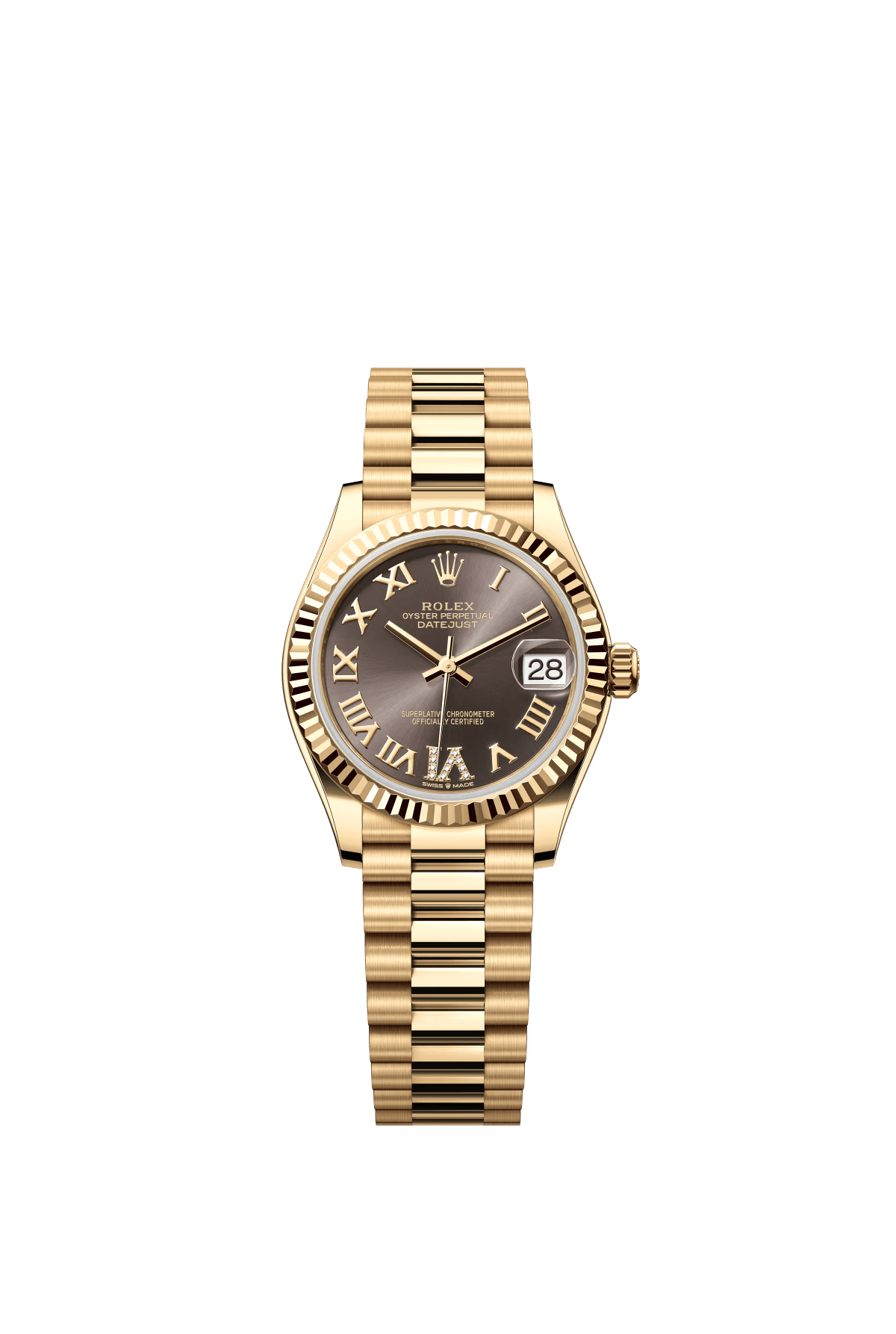 The Oyster Perpetual Datejust 31 is in 18 ct yellow gold with a dark grey diamond-set dial and a President bracelet. -m278278-0032