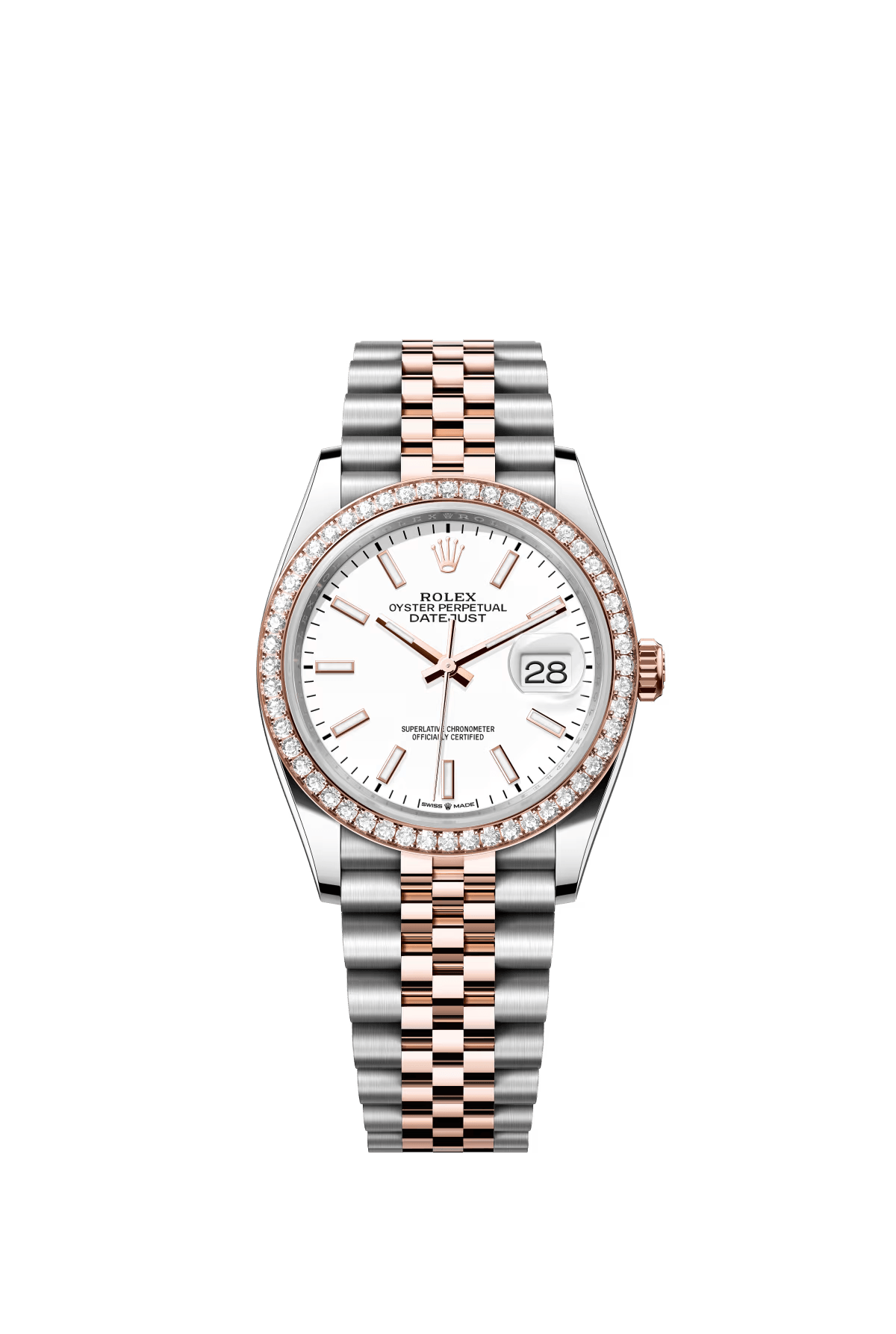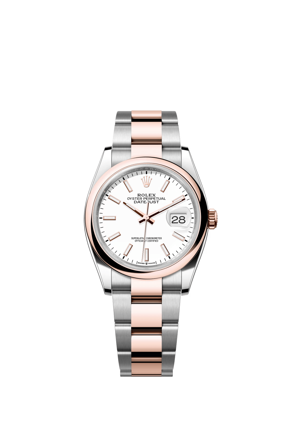 The Oyster Perpetual Datejust 36 is available in Everose gold and Oystersteel. with a white dial and an Oyster bracelet. -m126201-0018