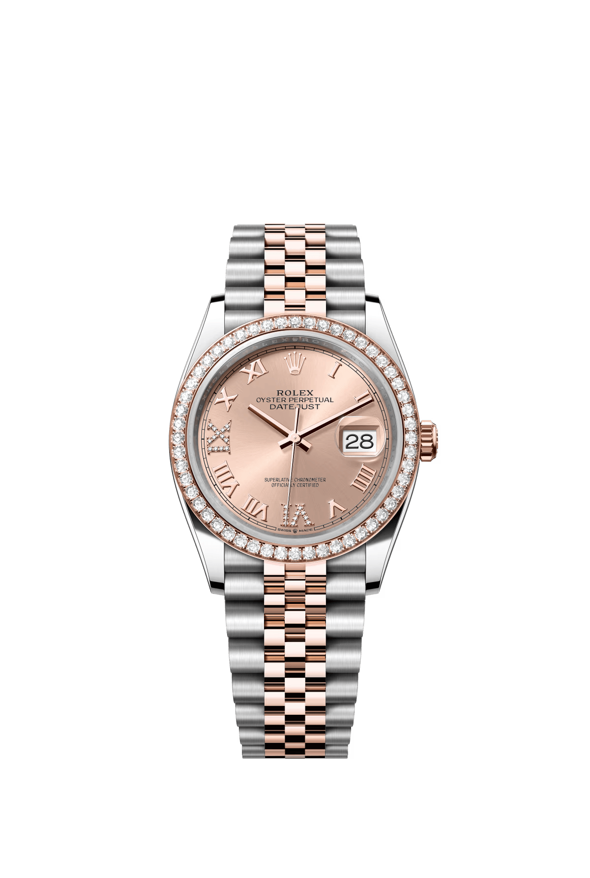 The Oyster Perpetual Datejust 36 is available in Everose gold and Oystersteel with a rose gold-tone diamond-set dial and a Jubilee bracelet. -m126281rbr-0015