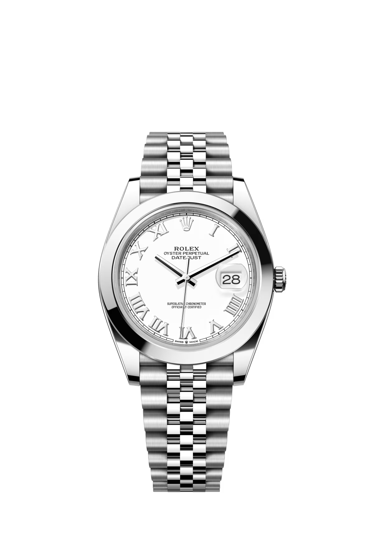 The Oyster Perpetual Datejust 41 is available in Oyster steel with a white dial and a Jubilee bracelet. -m126300-0016