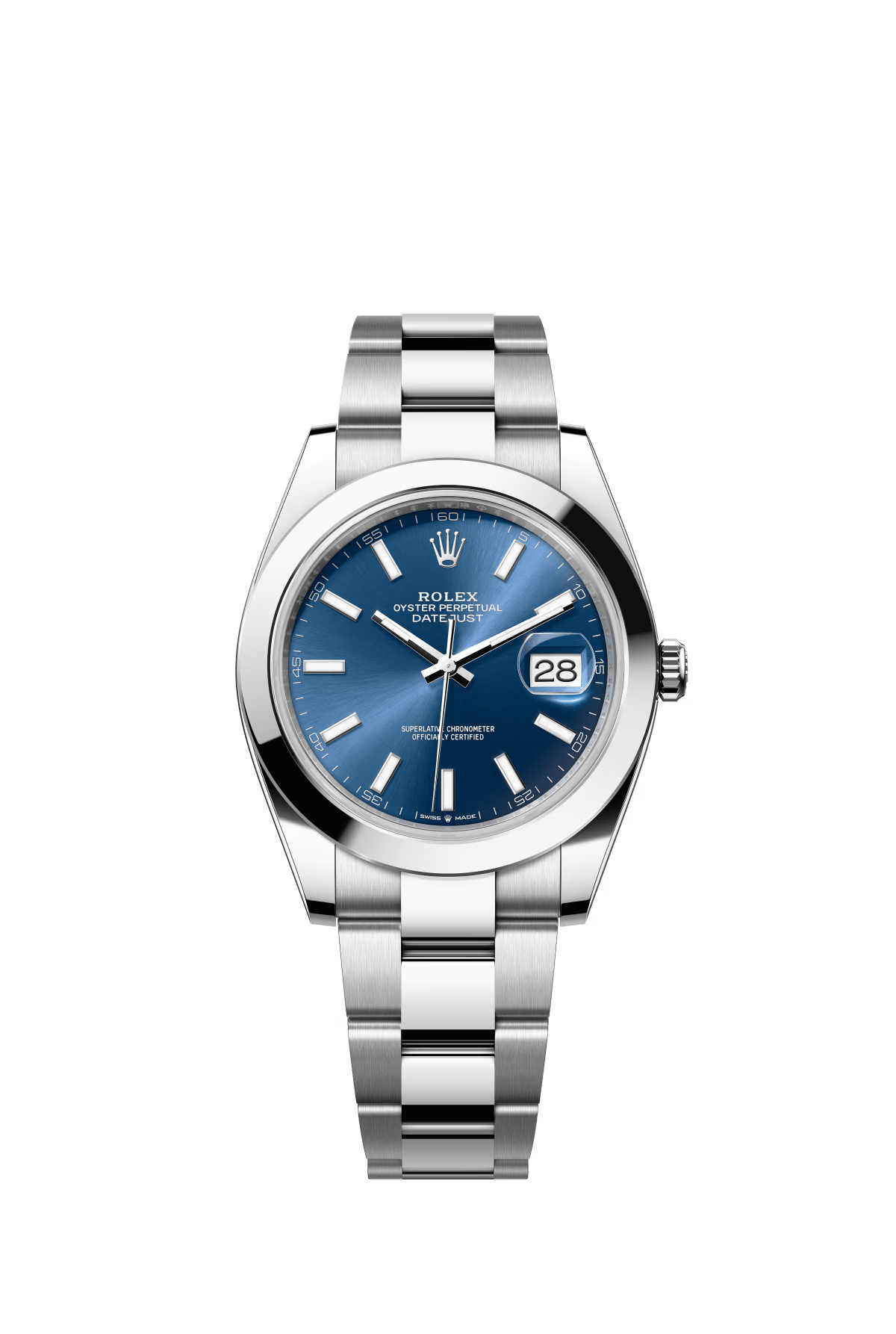 The Oyster Perpetual Datejust 41 is available in Oystersteel with a bright blue dial and an Oyster bracelet. -m126300-0001