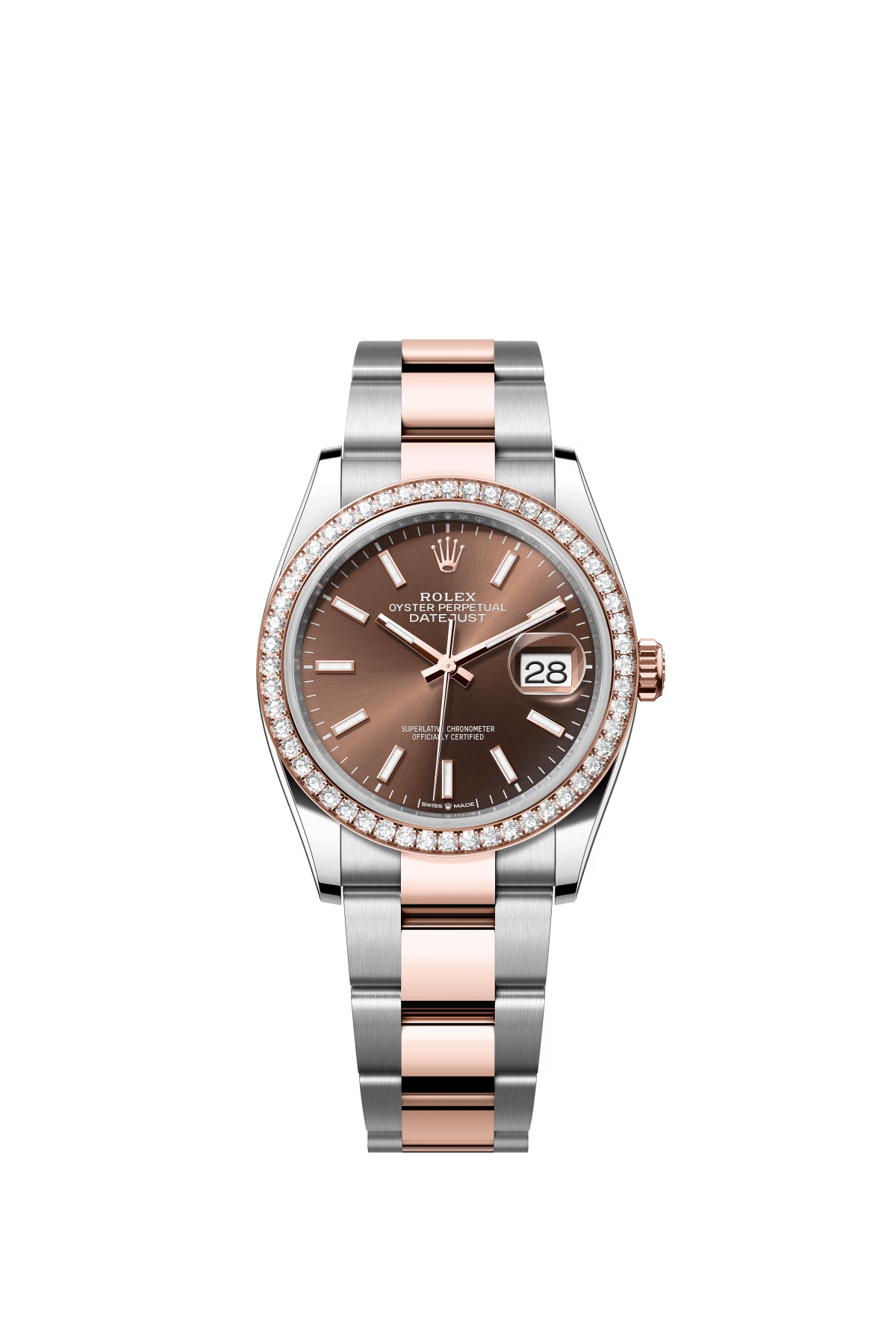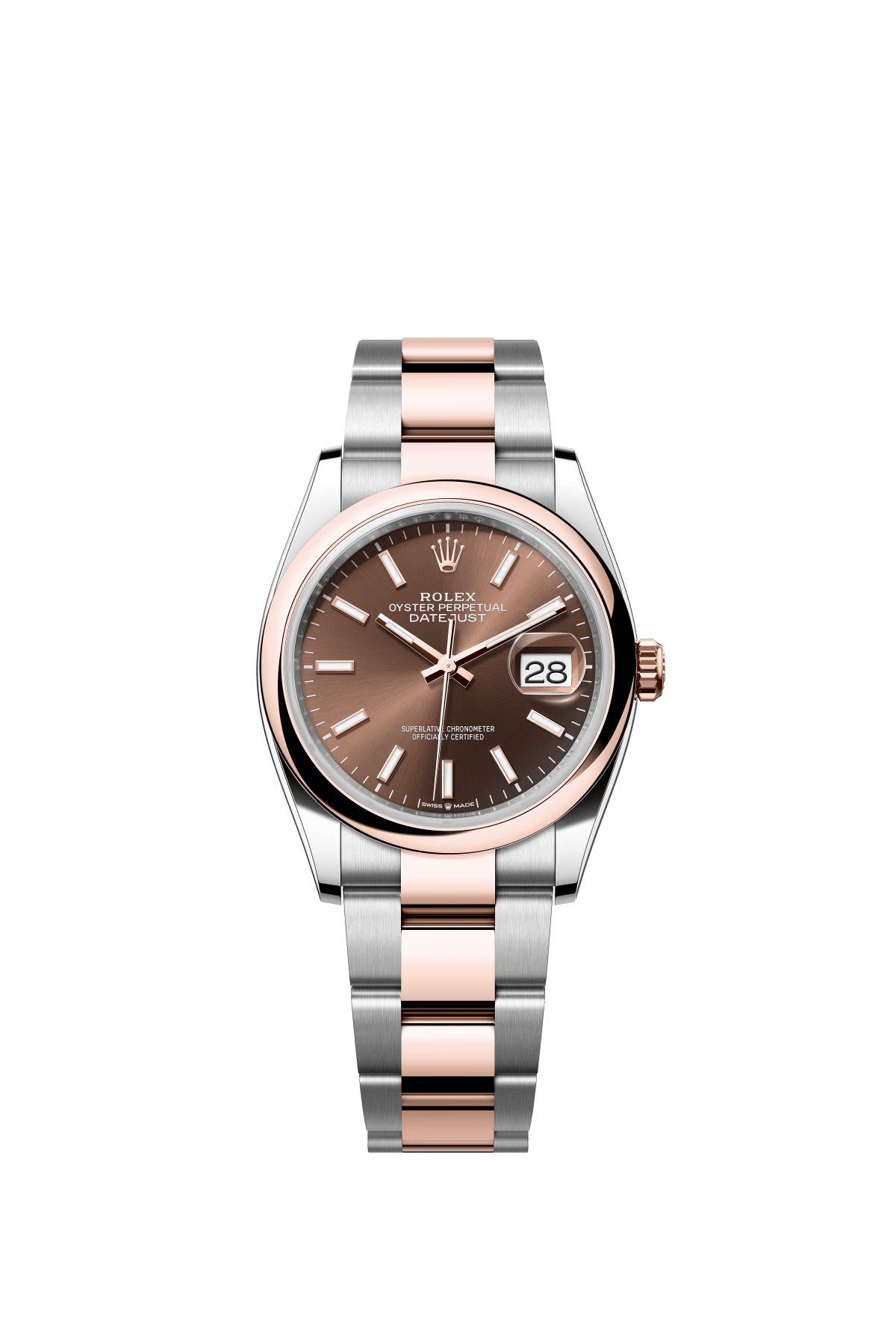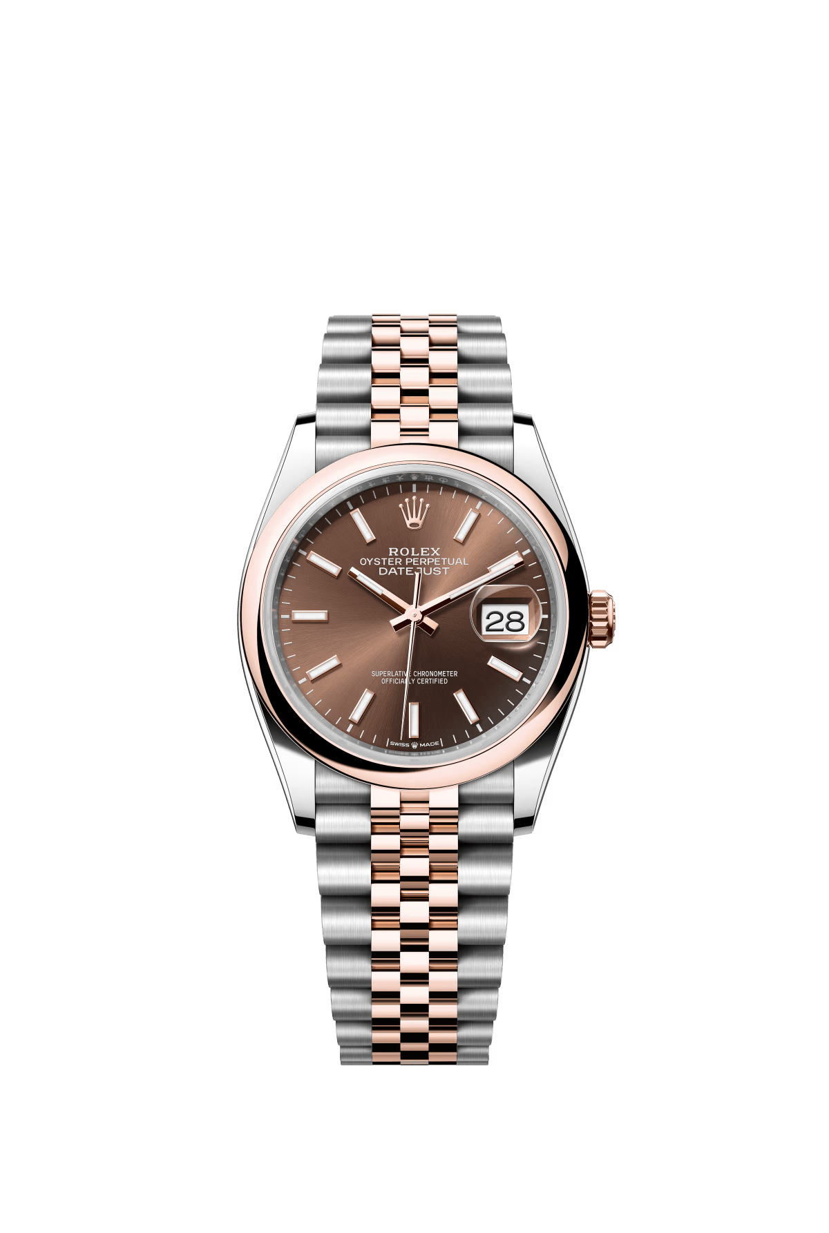 The Oyster Perpetual Datejust 36 is available in Everose gold and Oysteel with a chocolate-coloured dial and an Oyster bracelet. -m126281rbr-0032