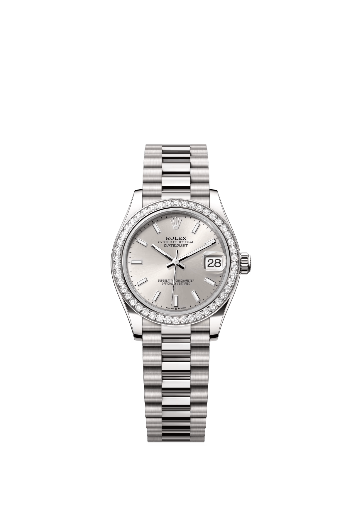 The Oyster Perpetual Datejust 31 is available in 18 ct white gold with a silver dial and a President bracelet. -m278289rbr-0012