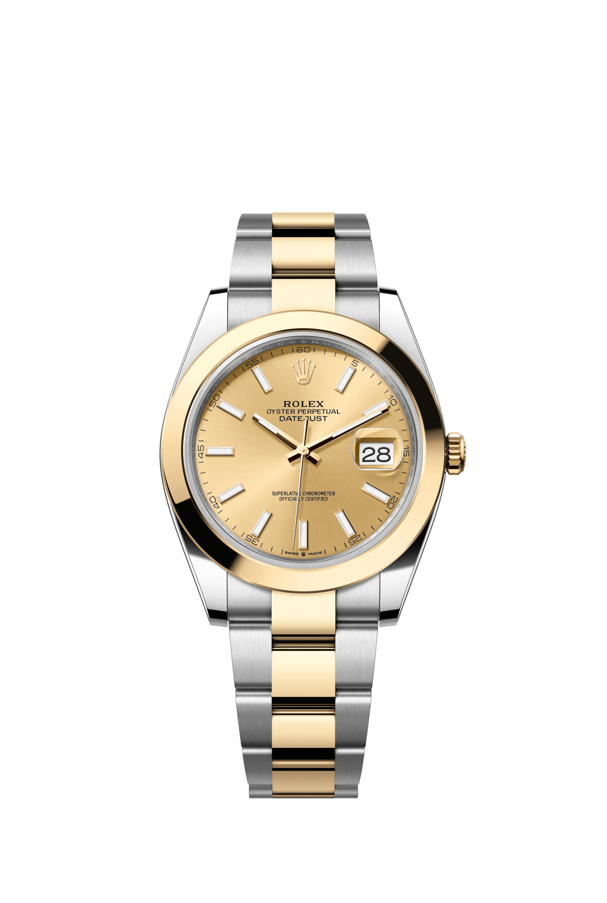 The Oyster Perpetual Datejust 41 is available in yellow gold and Oysteel. with a champagne-coloured dial and an Oyster bracelet. -m126303-0009