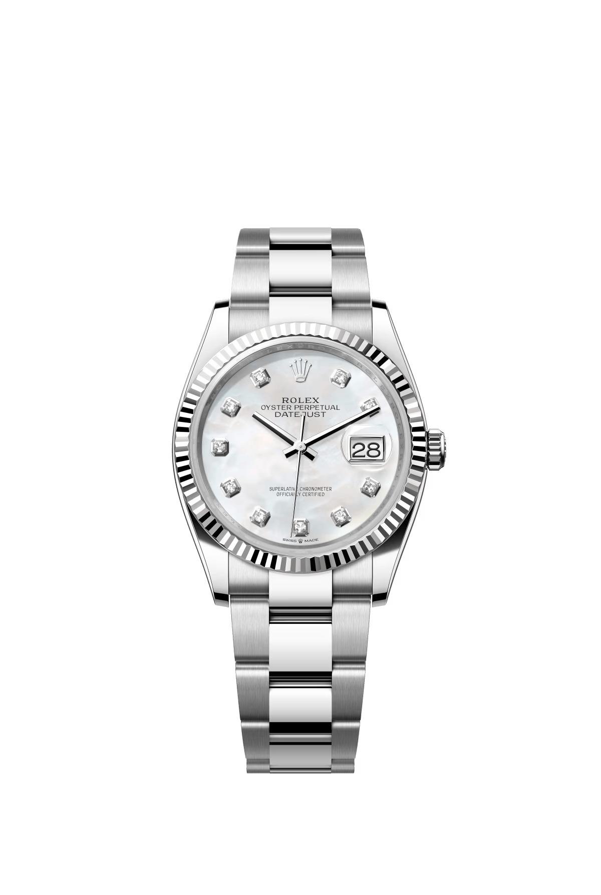 The Oyster Perpetual Datejust 36 is available in white gold and Oystersteel with a diamond-set white mother-of-pearl dial and an Oyster bracelet. -m126234-0020