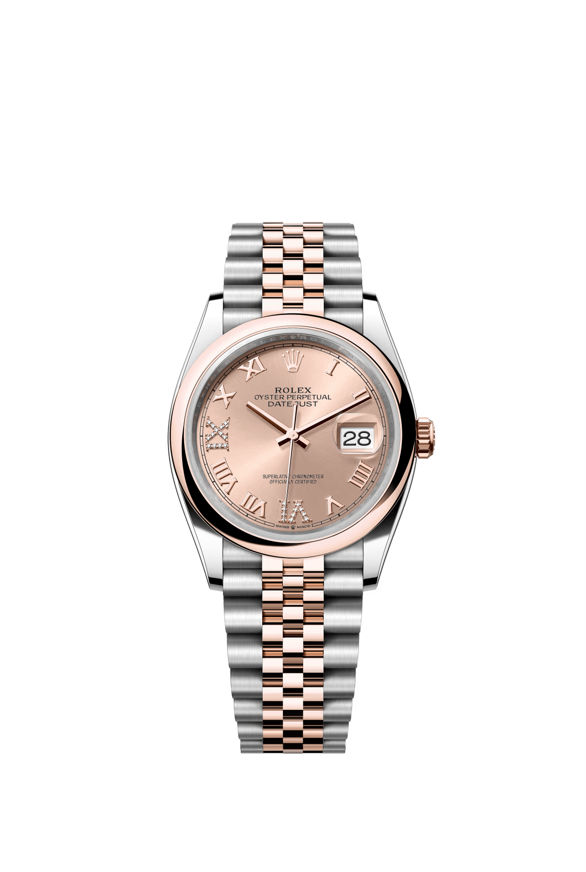 The Oyster Perpetual Datejust 36 is available in Everose gold and Oystersteel with a rose gold-tone diamond-set dial and a Jubilee bracelet. -m126201-0027