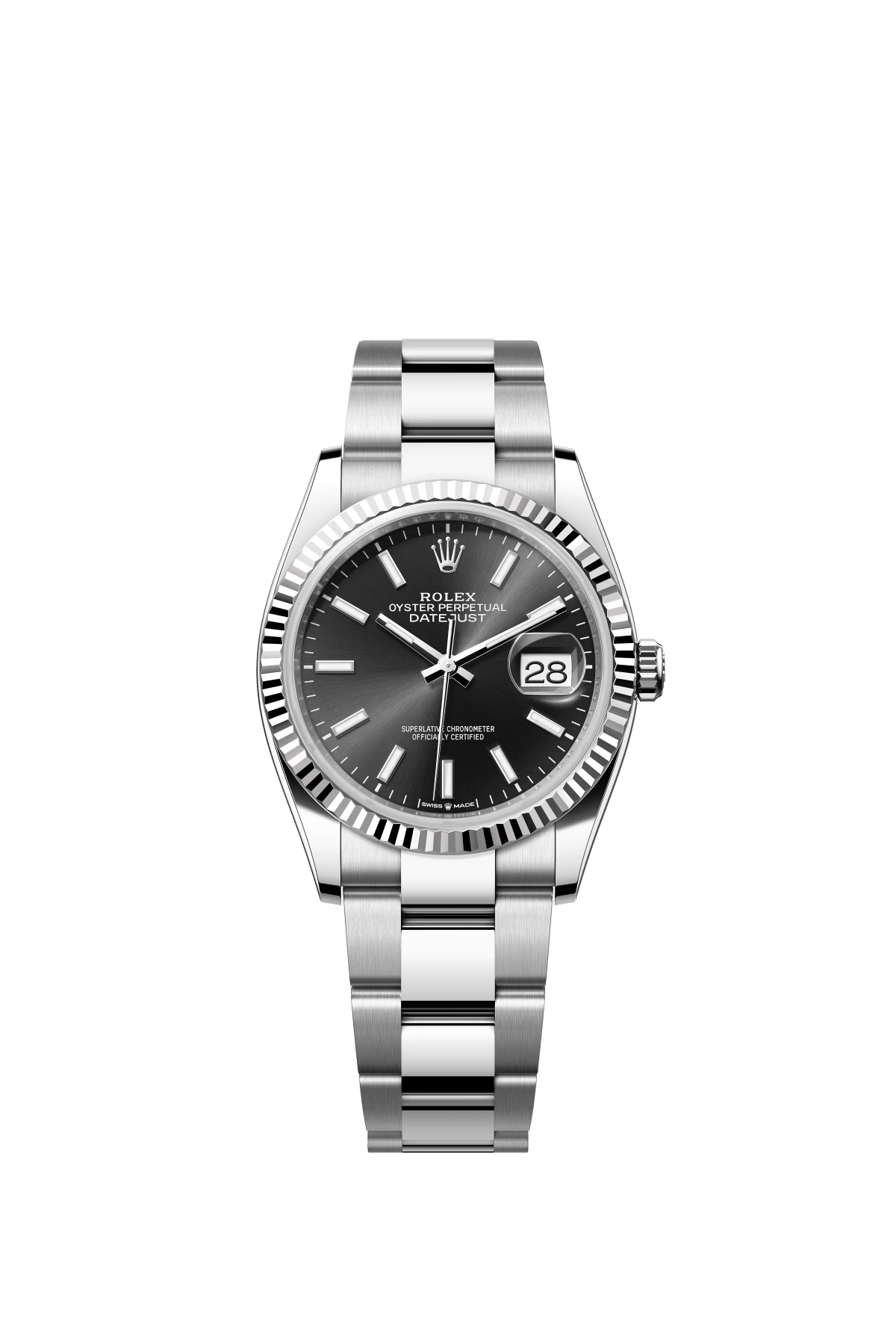 The Oyster Perpetual Datejust 36 is available in white gold and Oystersteel with a glossy black dial and an Oyster bracelet. -m126234-0016