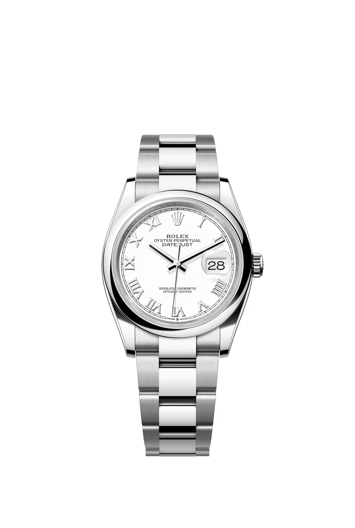 The Oyster Perpetual Datejust 36 is made in Oyster steel with a white dial and an Oyster bracelet. -m126200-0008
