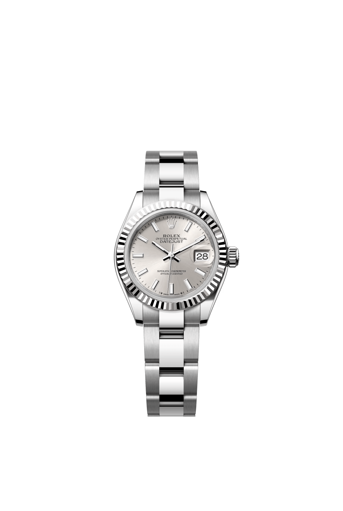 The Oyster Perpetual Lady-Datejust is available in white gold and Oystersteel with a silver dial and Oyster bracelet. -m279174-0006 28mm