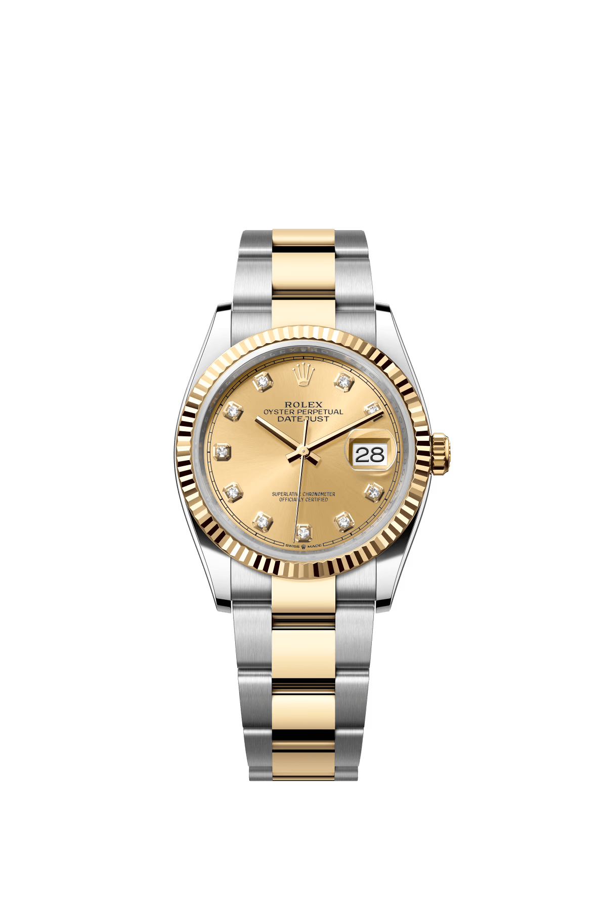 The Oyster Perpetual Datejust 36 in yellow gold and Oysteel with a diamond-set champagne dial and an Oyster bracelet. -m126233-0018