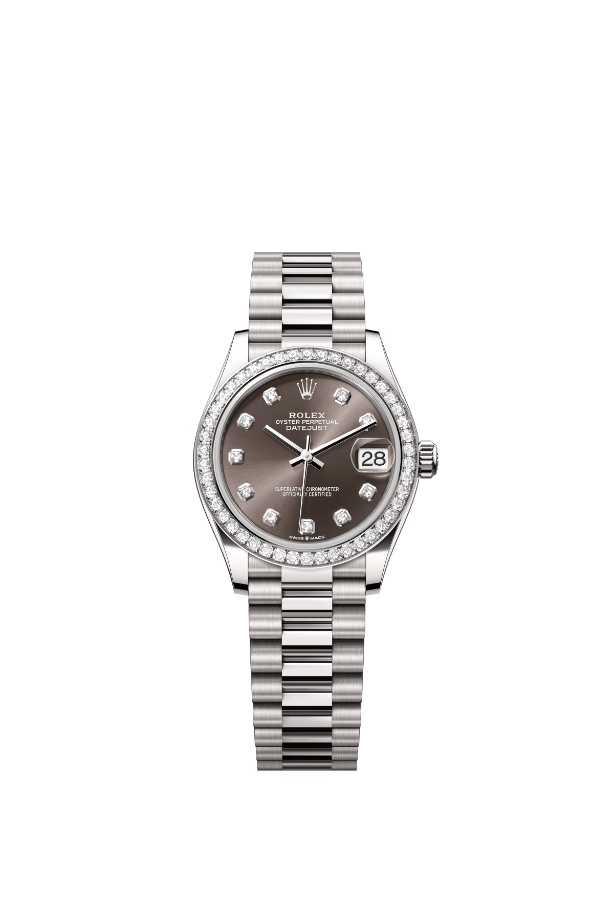 The Oyster Perpetual Datejust 31 is available in 18 ct white gold with a diamond-set dark grey dial and a President bracelet. -m278289rbr-0006