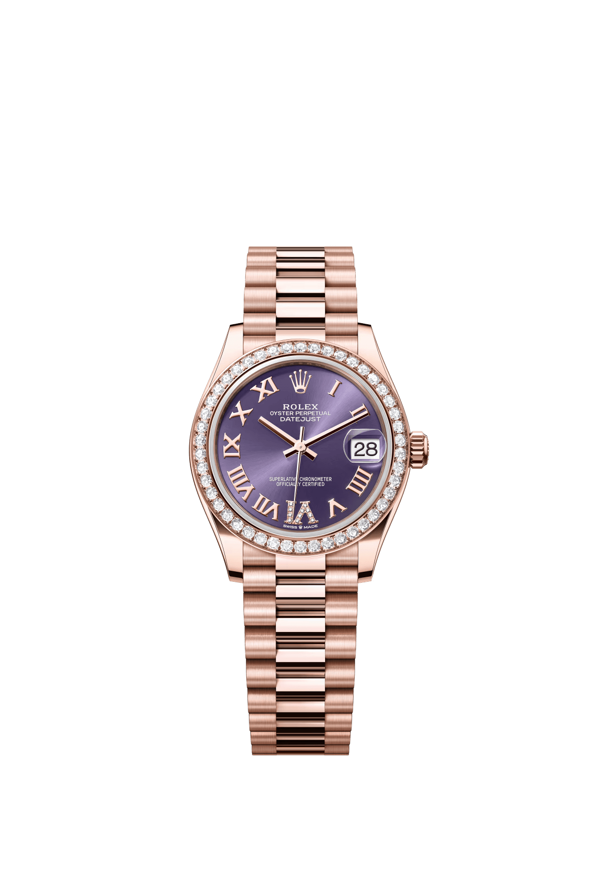 The Oyster Perpetual Datejust 31 in 18 ct Everose gold with a diamond-set eggplant purple dial and a President bracelet. -m278285rbr-0023