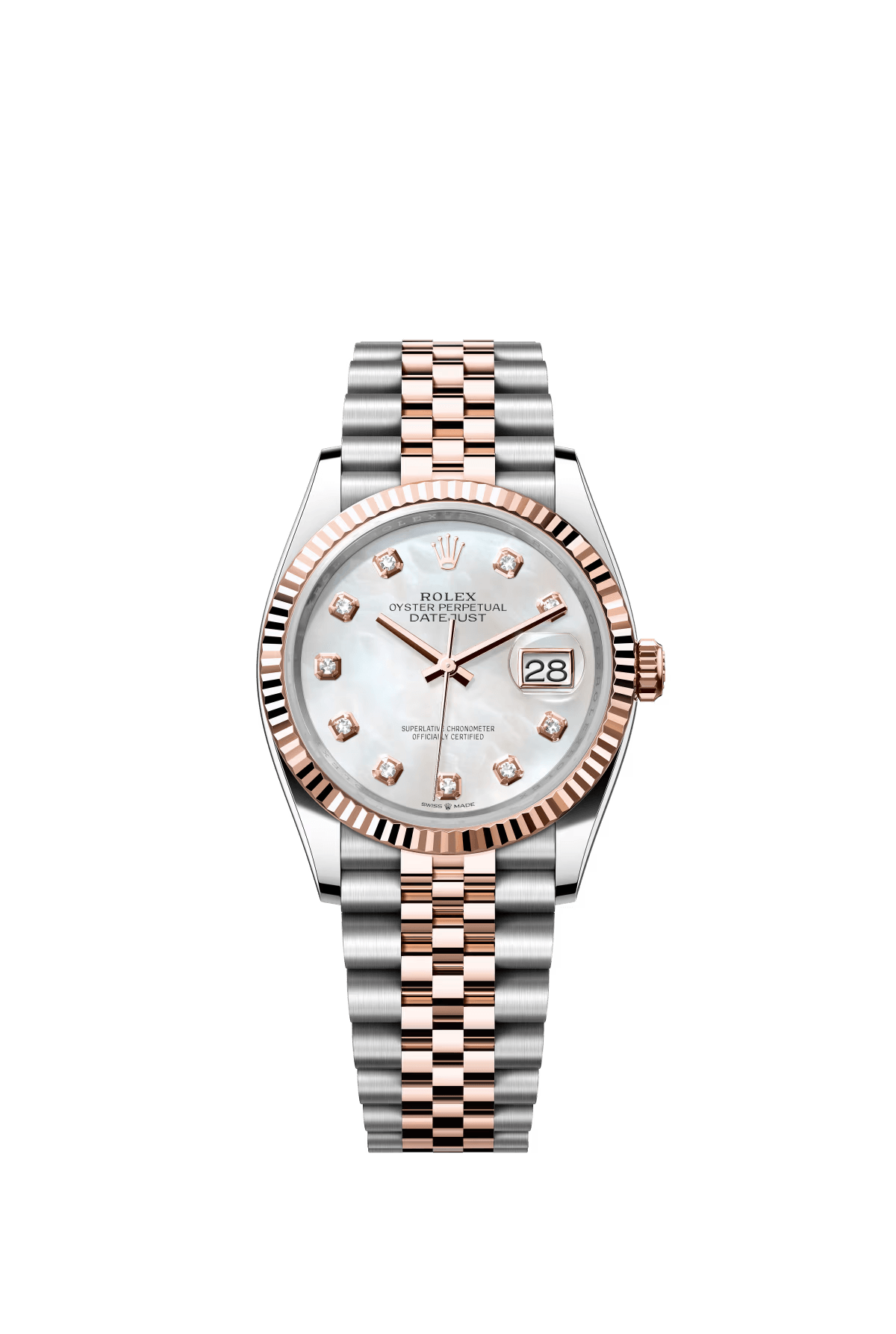The Oyster Perpetual Datejust 36 is available in Everose gold and Oystersteel with a diamond-set white mother-of-pearl dial and a Jubilee bracelet. -m126231-0021