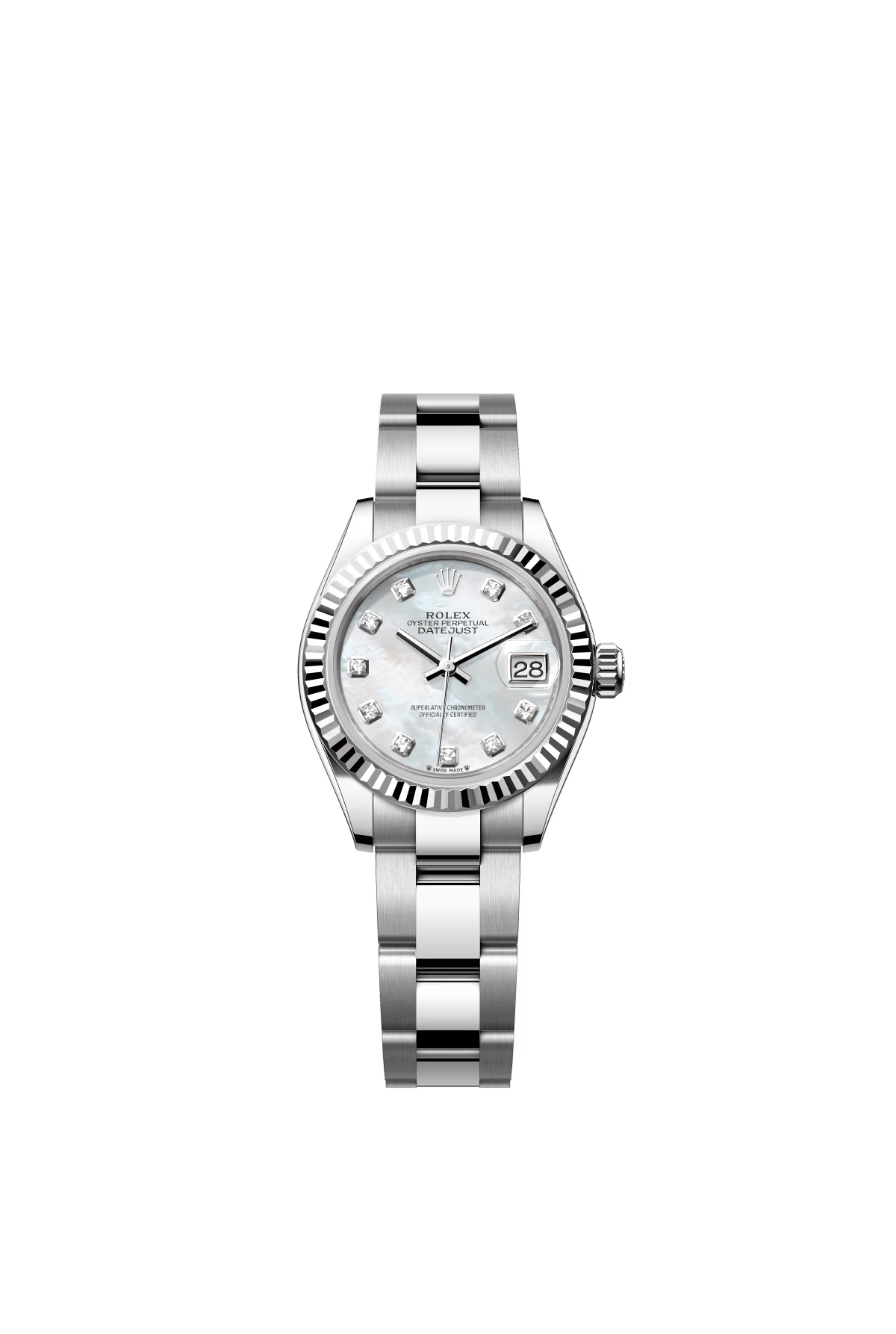 The Oyster Perpetual Lady-Datejust in white gold and Oystersteel with a diamond-set white mother-of-pearl dial and an Oyster bracelet. -m279174-0010 28mm