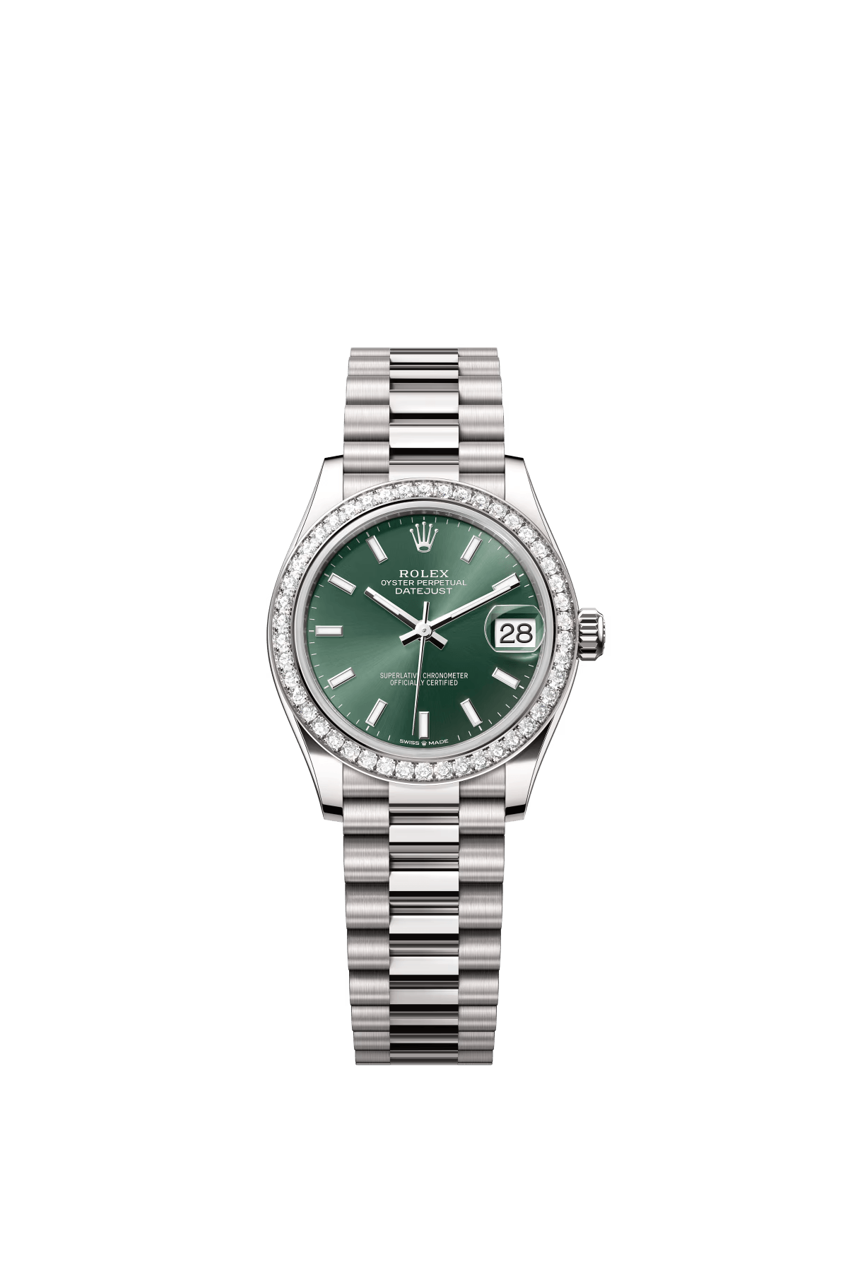 The Oyster Perpetual Datejust 31 is in 18 ct white gold with a mint green dial and a President bracelet. -m278289rbr-0015