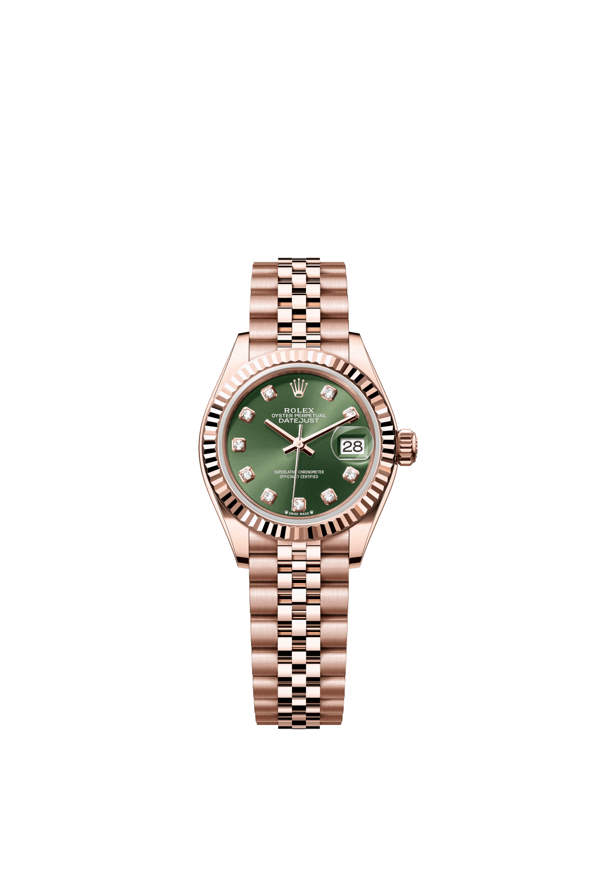 The Oyster Perpetual Lady-Datejust in 18 ct Everose gold with a diamond-set olive green dial and a Jubilee bracelet. -m279175-0013 28mm