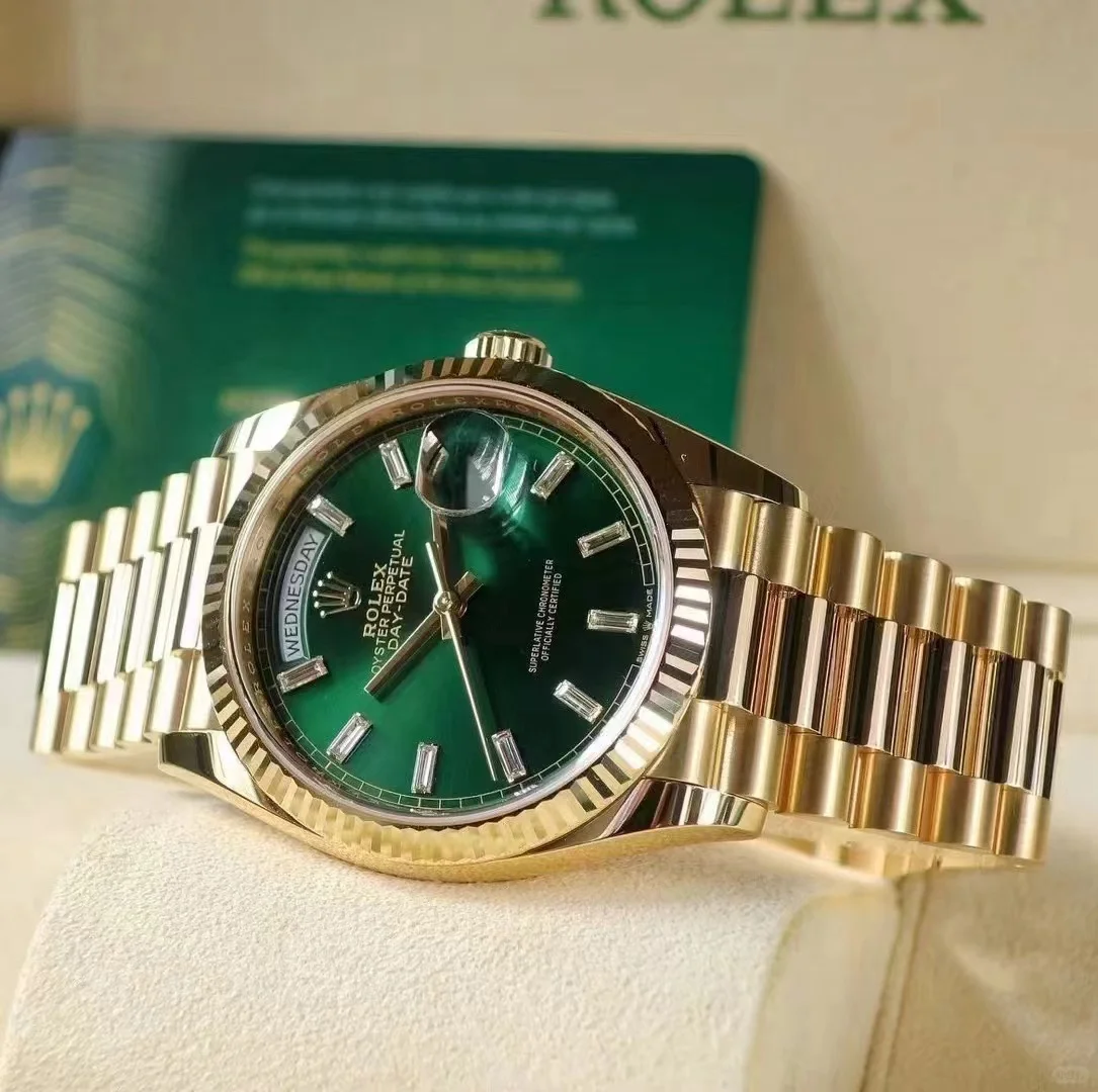 • The Oyster Perpetual Day-Date 36 in 18 ct yellow gold with a brilliant green diamond-set dial. fluted bezel and President bracelet. -m128238-0130