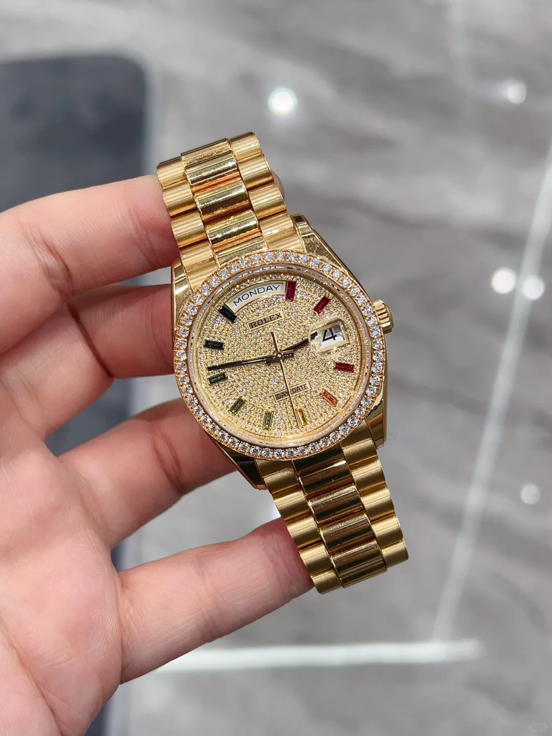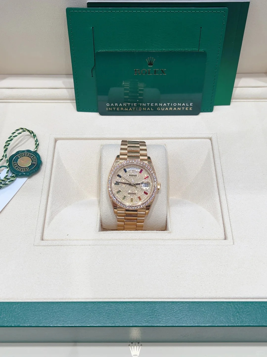 The Oyster Perpetual Day-Date 36 in 18 ct yellow gold with a diamond-paved dial. diamond-set bezel and President bracelet. -m128398tbr-0012