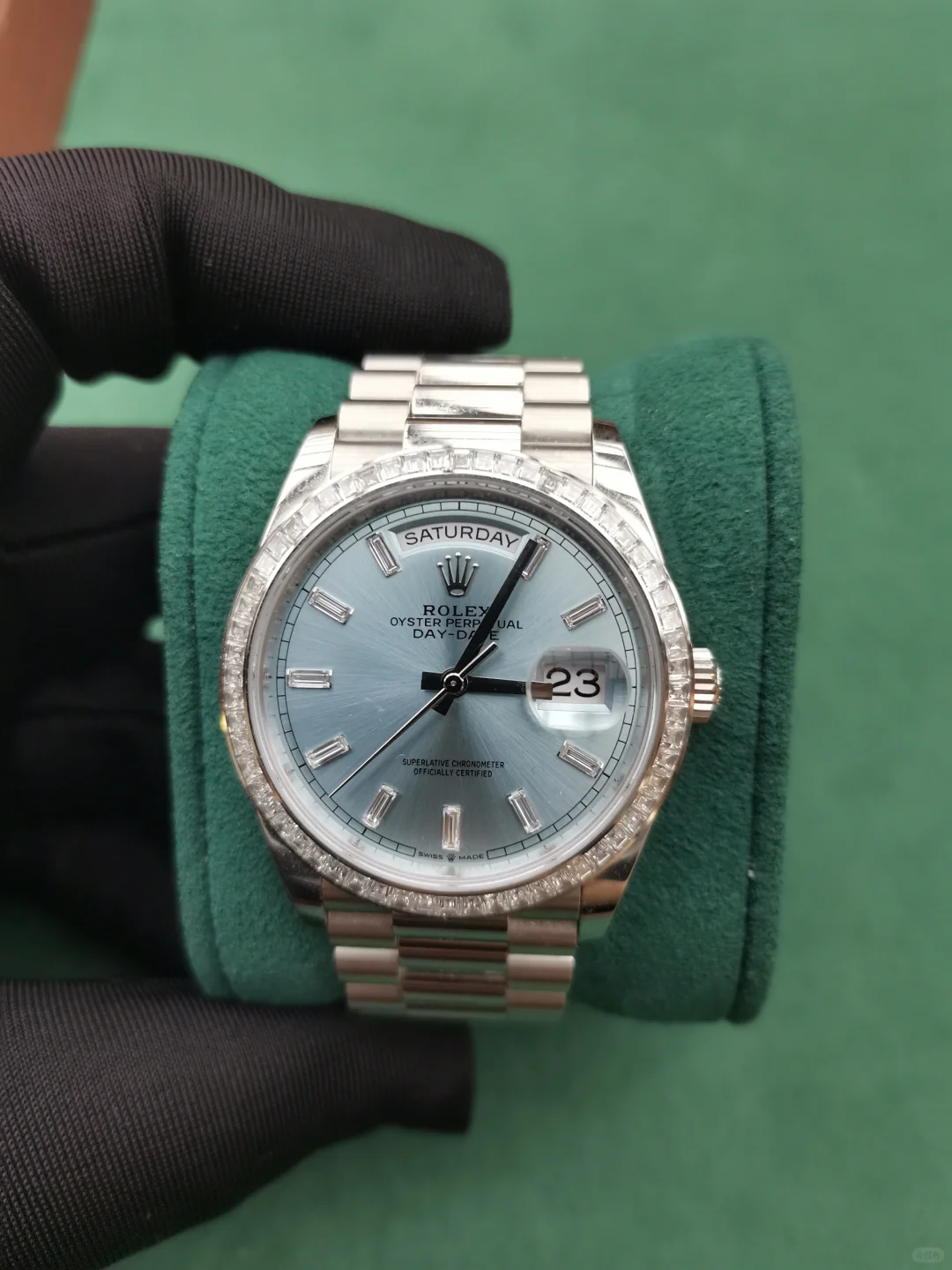 The Oyster Perpetual Day-Date 36 in platinum with an ice-blue dial. diamond-set bezel and President bracelet. -m128396tbr-0019
