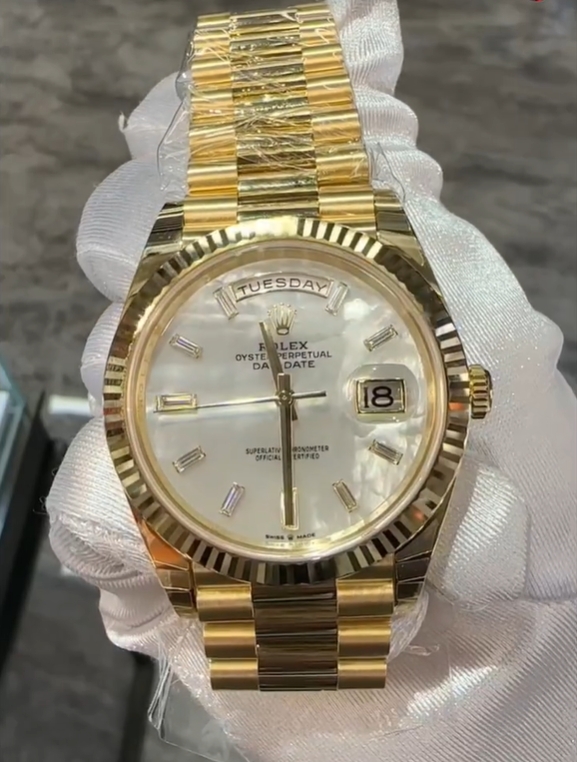 The Oyster Perpetual Day-Date 40 is in 18 ct yellow gold with a diamond-set white mother-of-pearl dial. fluted bezel and President bracelet. -m228238-0071