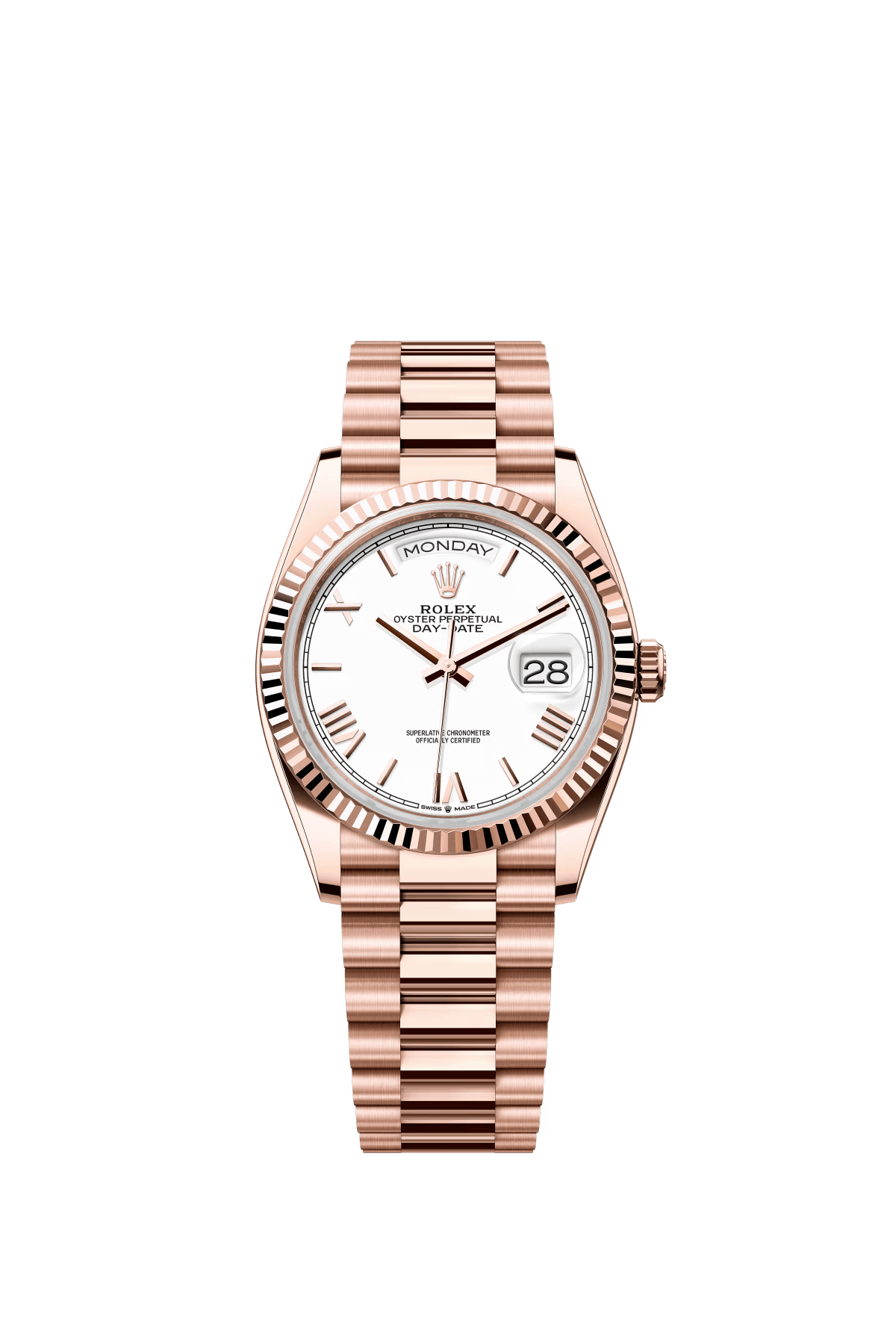 The Oyster Perpetual Day-Date 36 in 18 ct Everose gold with a white dial. fluted bezel and President bracelet. -m128235-0070
