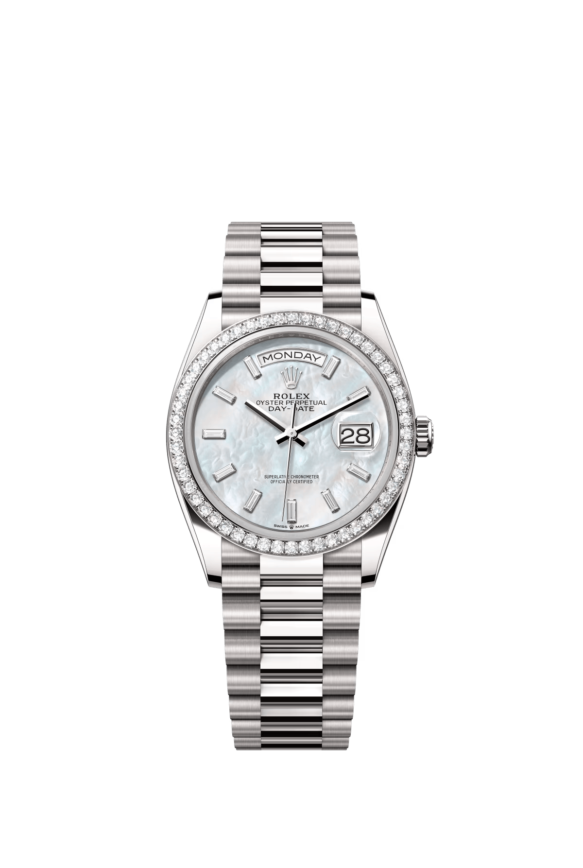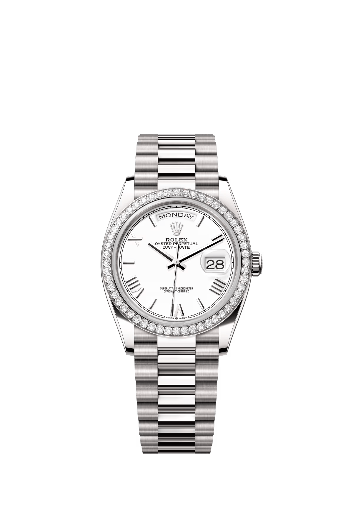 The Oyster Perpetual Day-Date 36 is available in 18 ct white gold with a white dial. diamond-set bezel and President bracelet. -m128349rbr-0043
