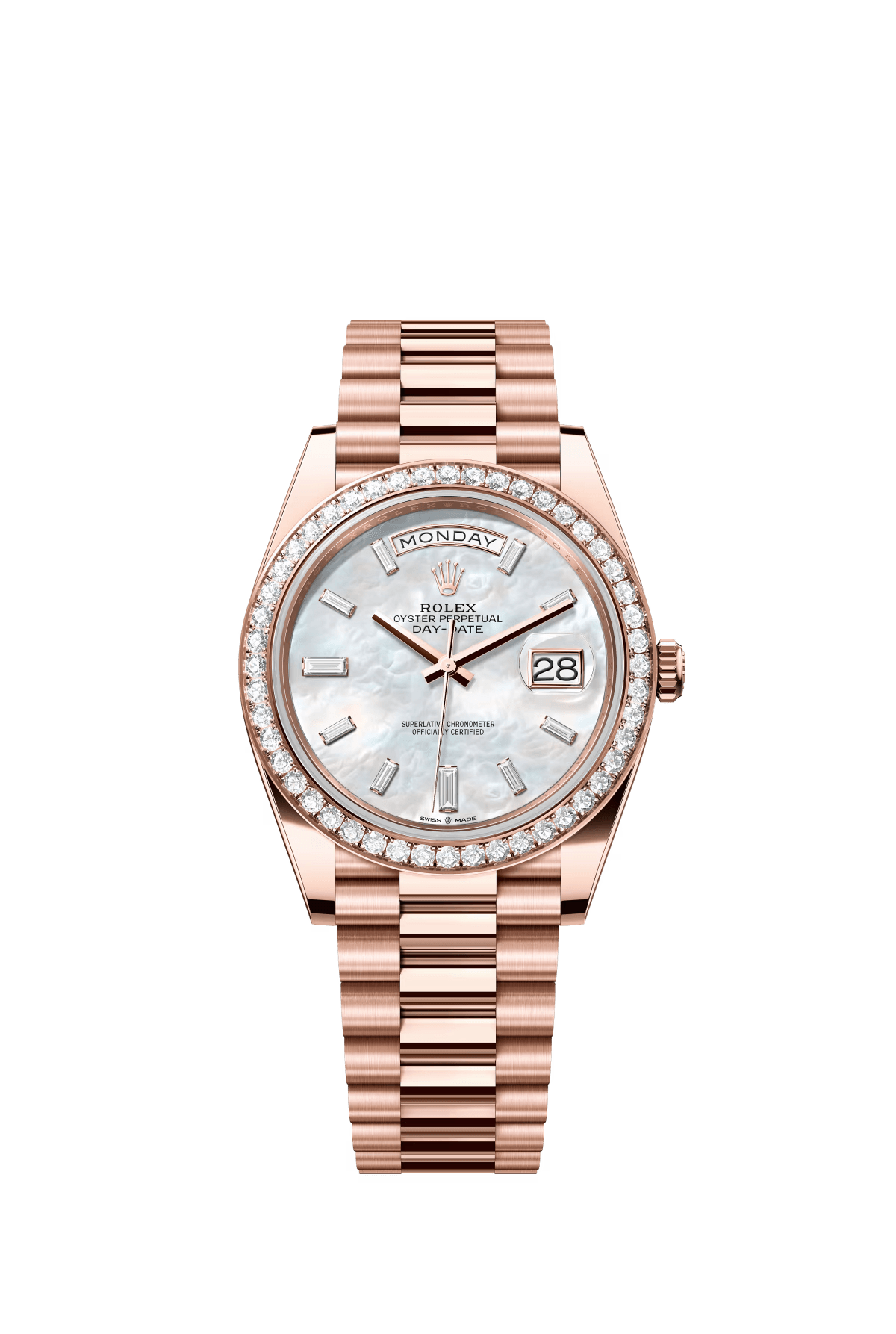 The Oyster Perpetual Day-Date 40 in 18 ct Everose gold features a diamond-set white mother-of-pearl dial. a diamond-set bezel and a President bracelet. -m228345rbr-0026