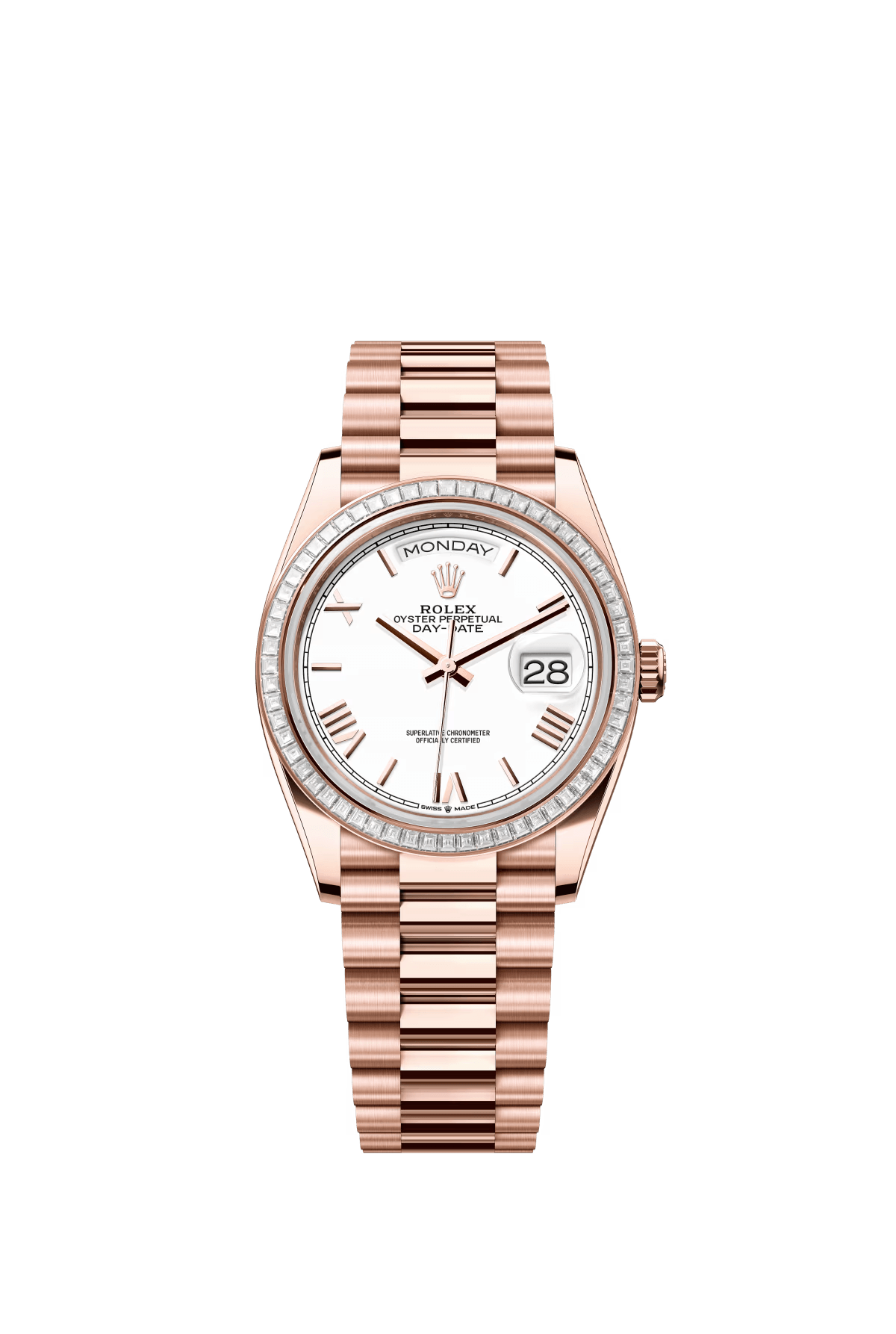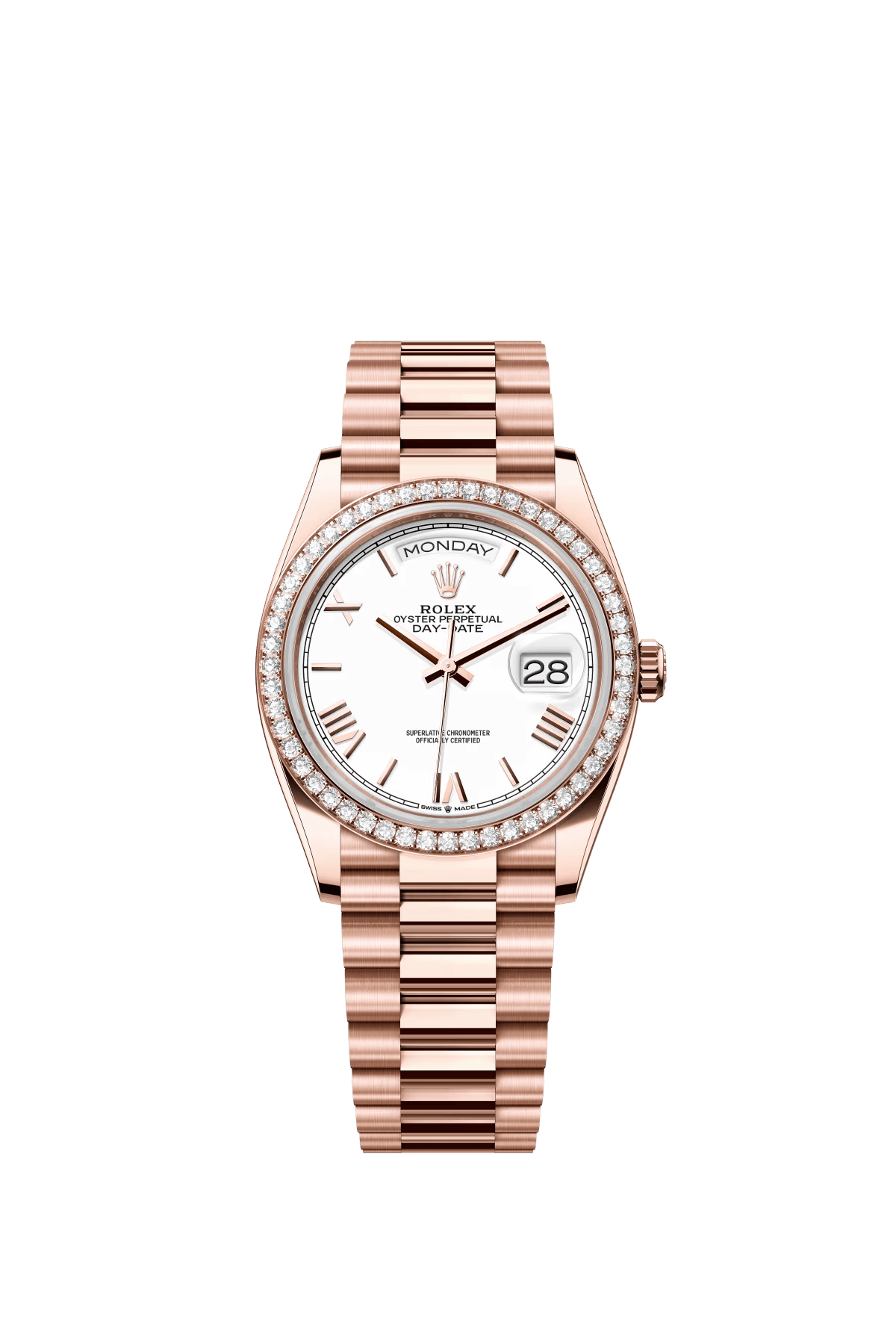 The Oyster Perpetual Day-Date 36 in 18-carat Everose gold with a white dial. diamond-set bezel and President bracelet. -m128345rbr-0070