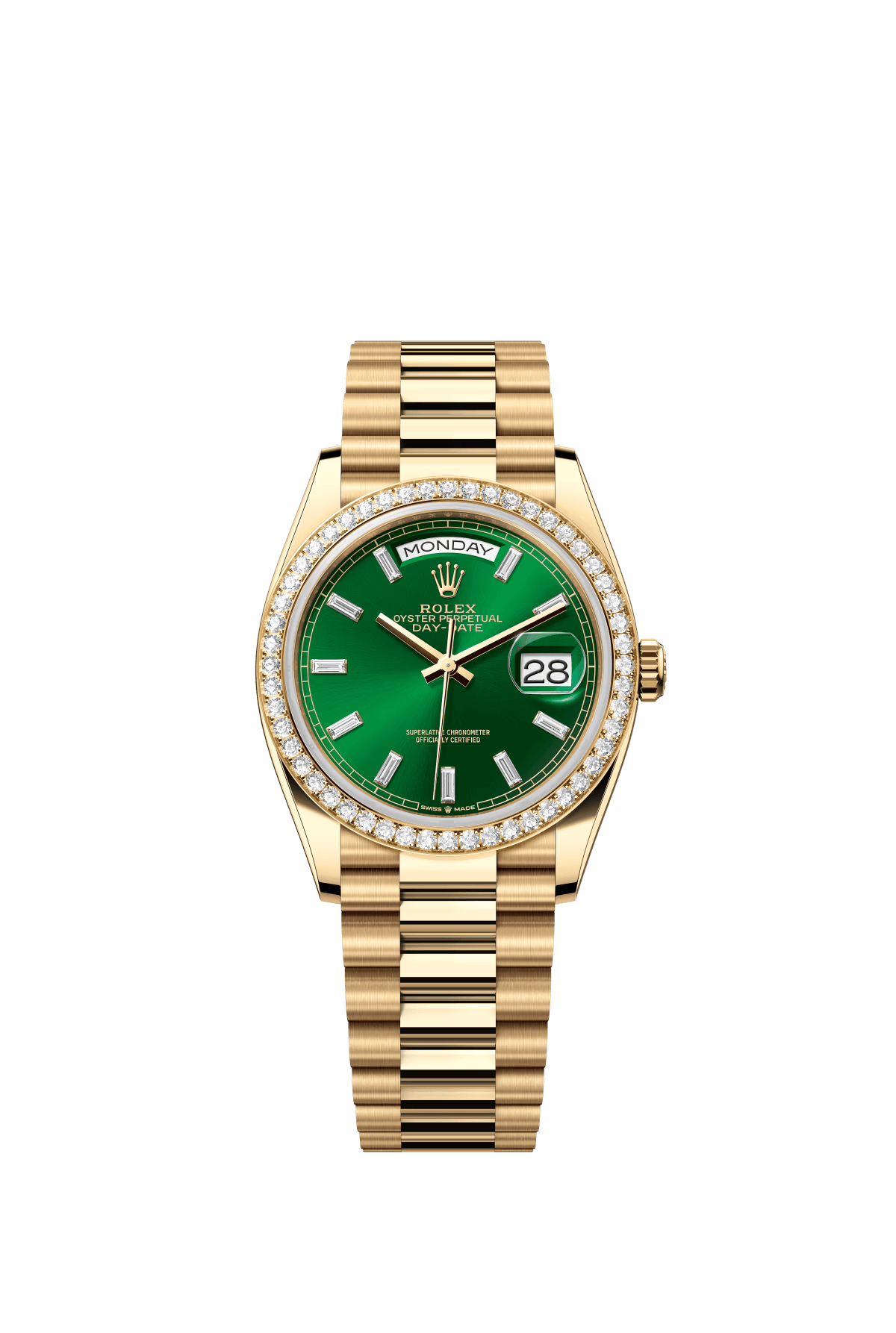 The Oyster Perpetual Day-Date 36 is in 18 ct yellow gold with a brilliant green diamond-set dial. a diamond-set bezel and a President bracelet. -m128348rbr-0078