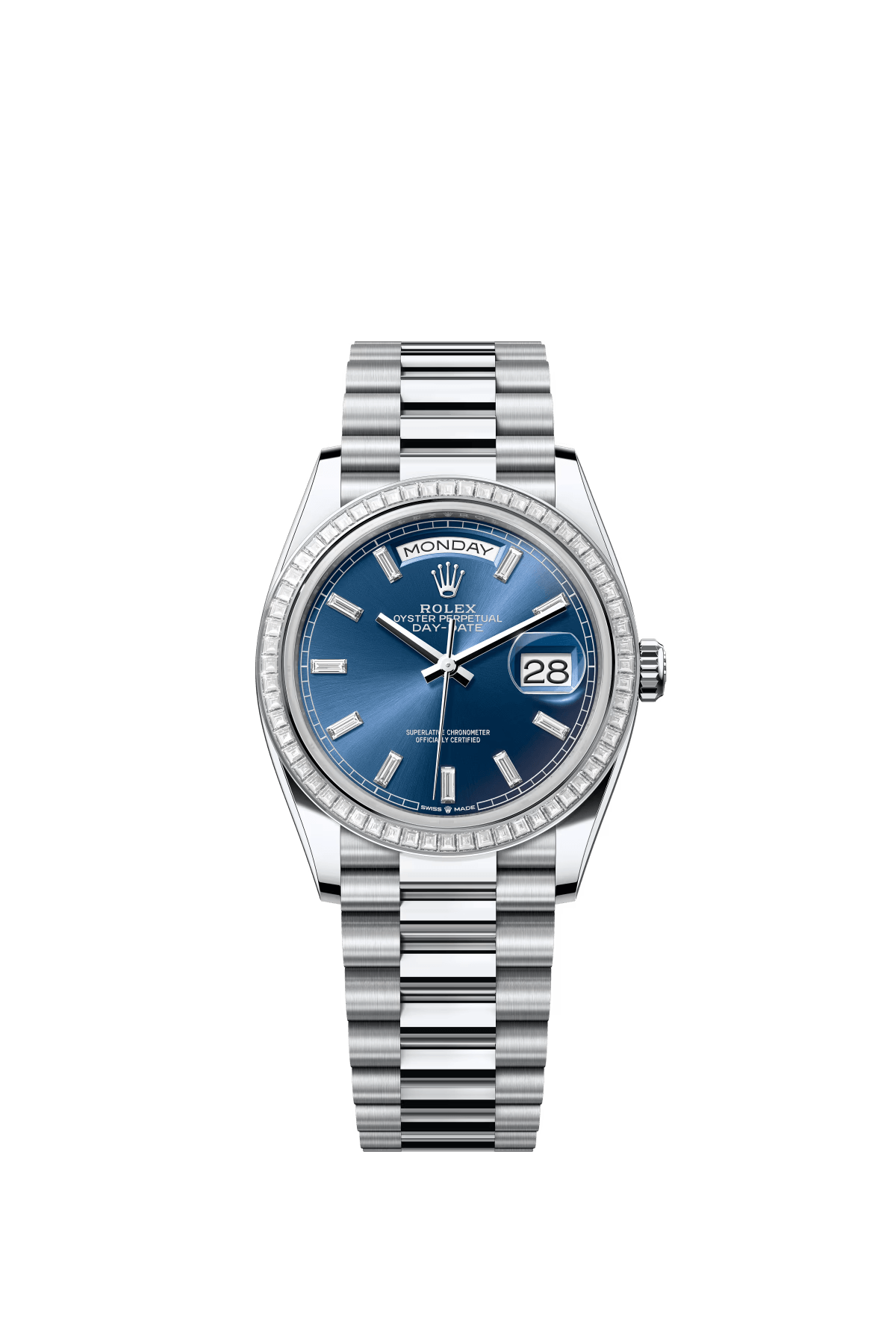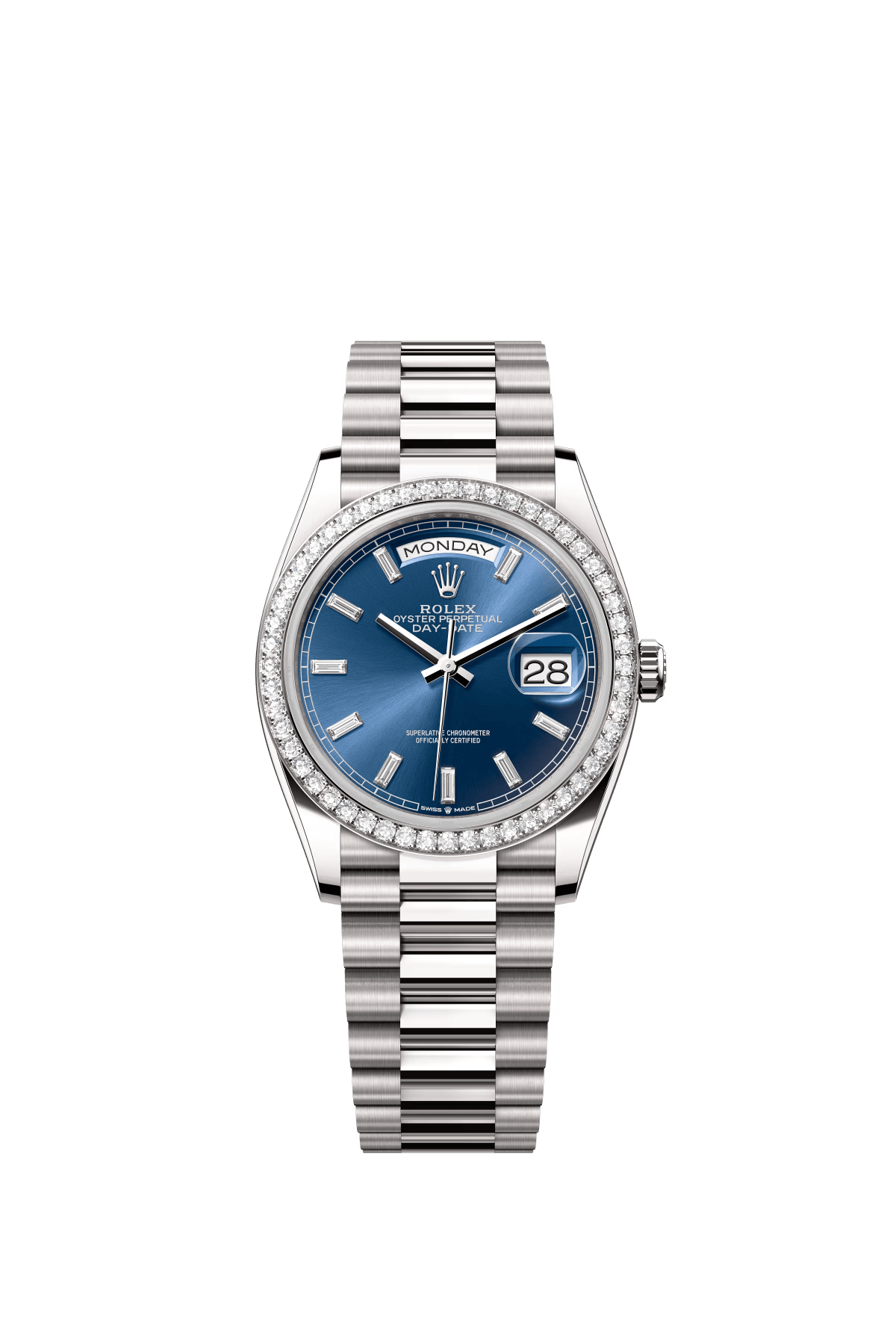 The Oyster Perpetual Day-Date 36 in platinum features a brilliant blue dial set with diamonds. a diamond-set bezel and a President bracelet. -m128396tbr-0024
