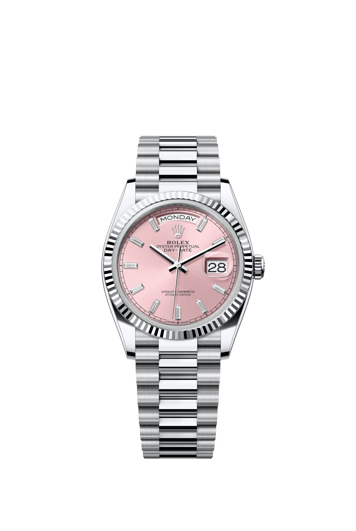 The Oyster Perpetual Day-Date 36 in platinum features a diamond-set pink dial. fluted bezel and a President bracelet. -m128236-0024