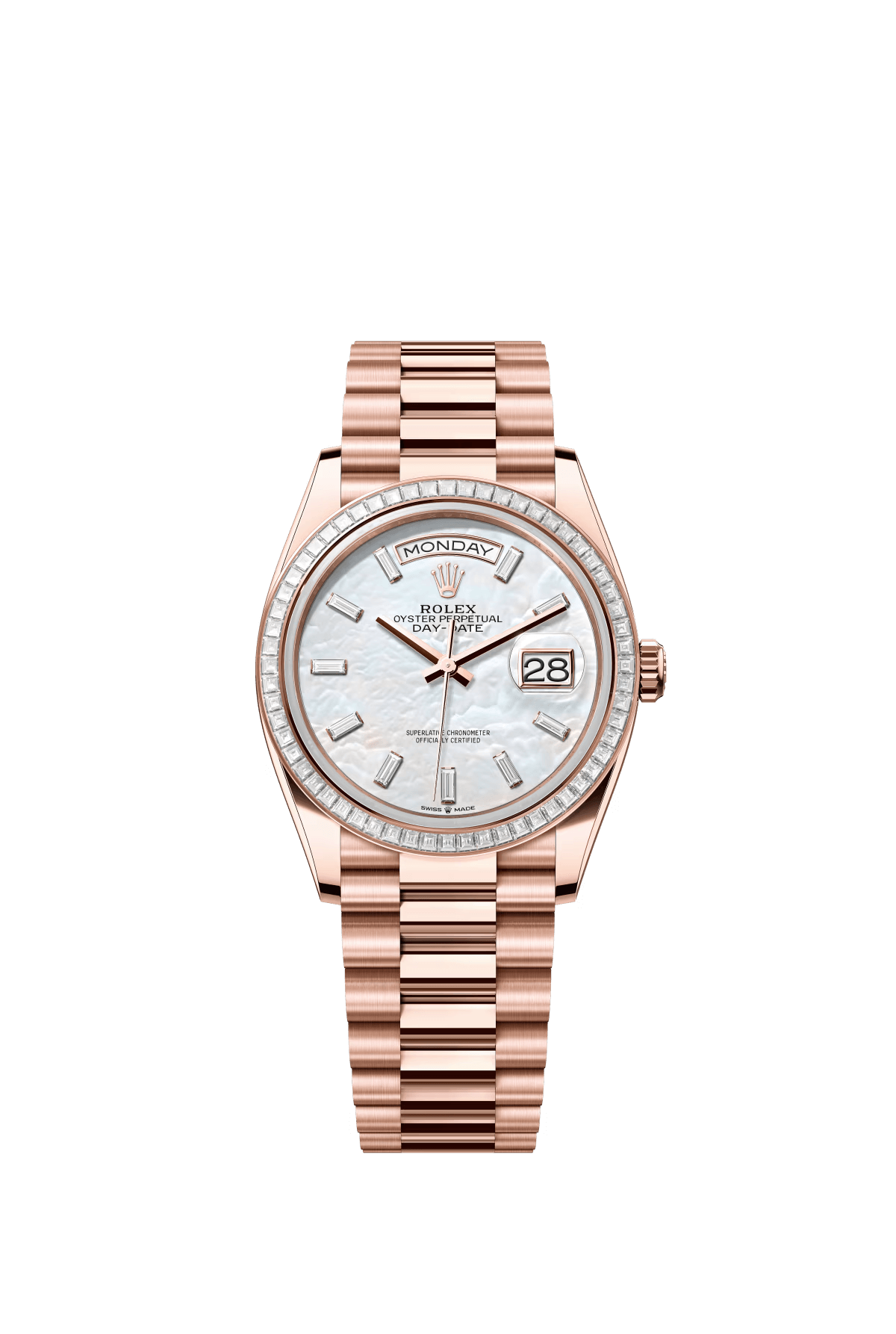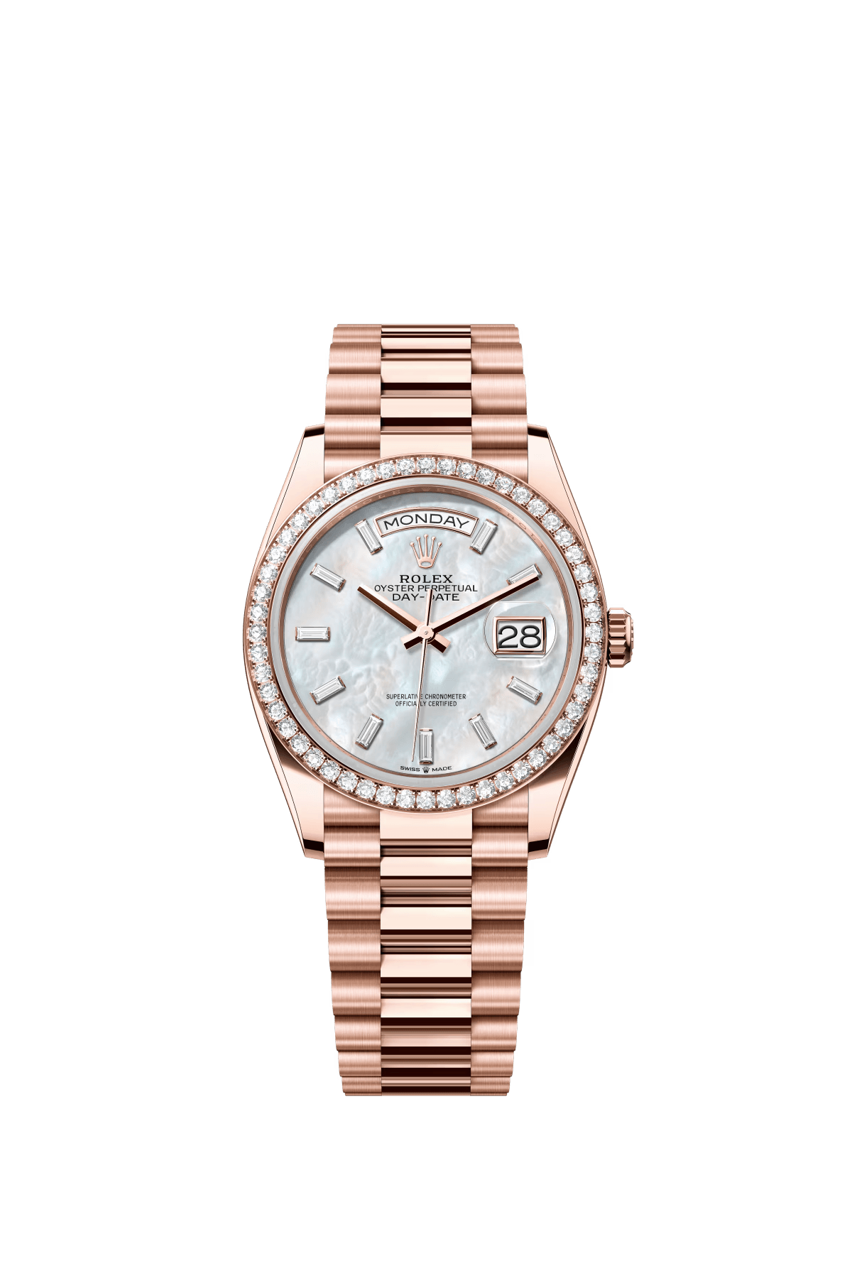 The Oyster Perpetual Day-Date 36 in 18 ct Everose gold features a diamond-set white mother-of-pearl dial. a diamond-set bezel and a President bracelet. -m128345rbr-0077