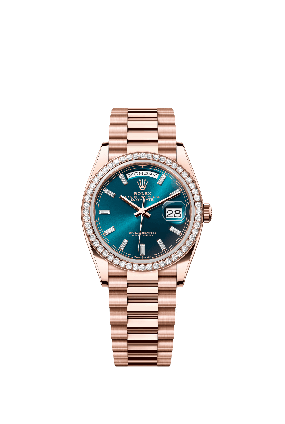 The Oyster Perpetual Day-Date 36 in 18-carat Everose gold with a diamond-set blue dial. diamond-set bezel and President bracelet. -m128345rbr-0083