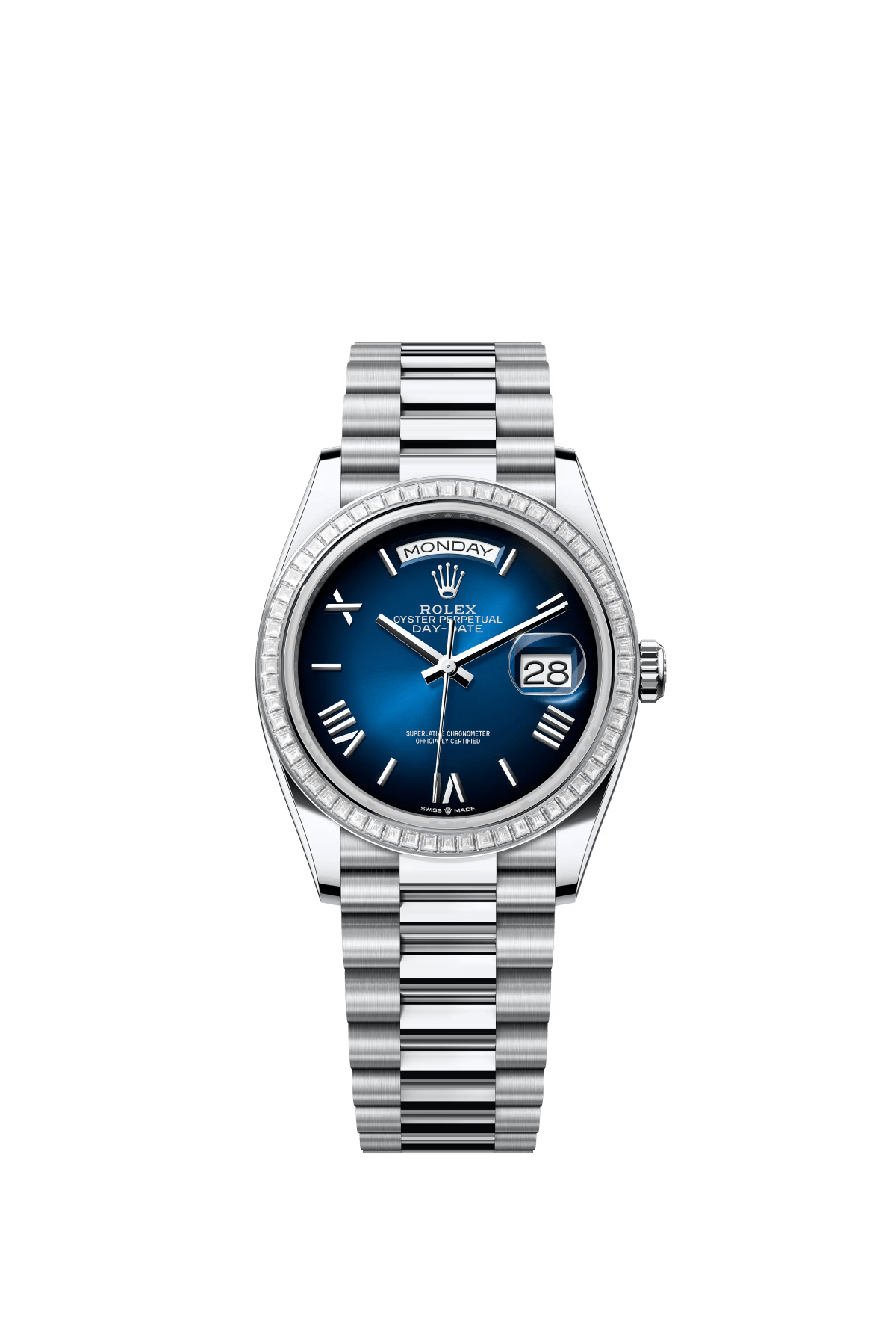 The Oyster Perpetual Day-Date 36 in platinum features a gradient blue dial. a diamond-set bezel and a President bracelet. -m128396tbr-0021