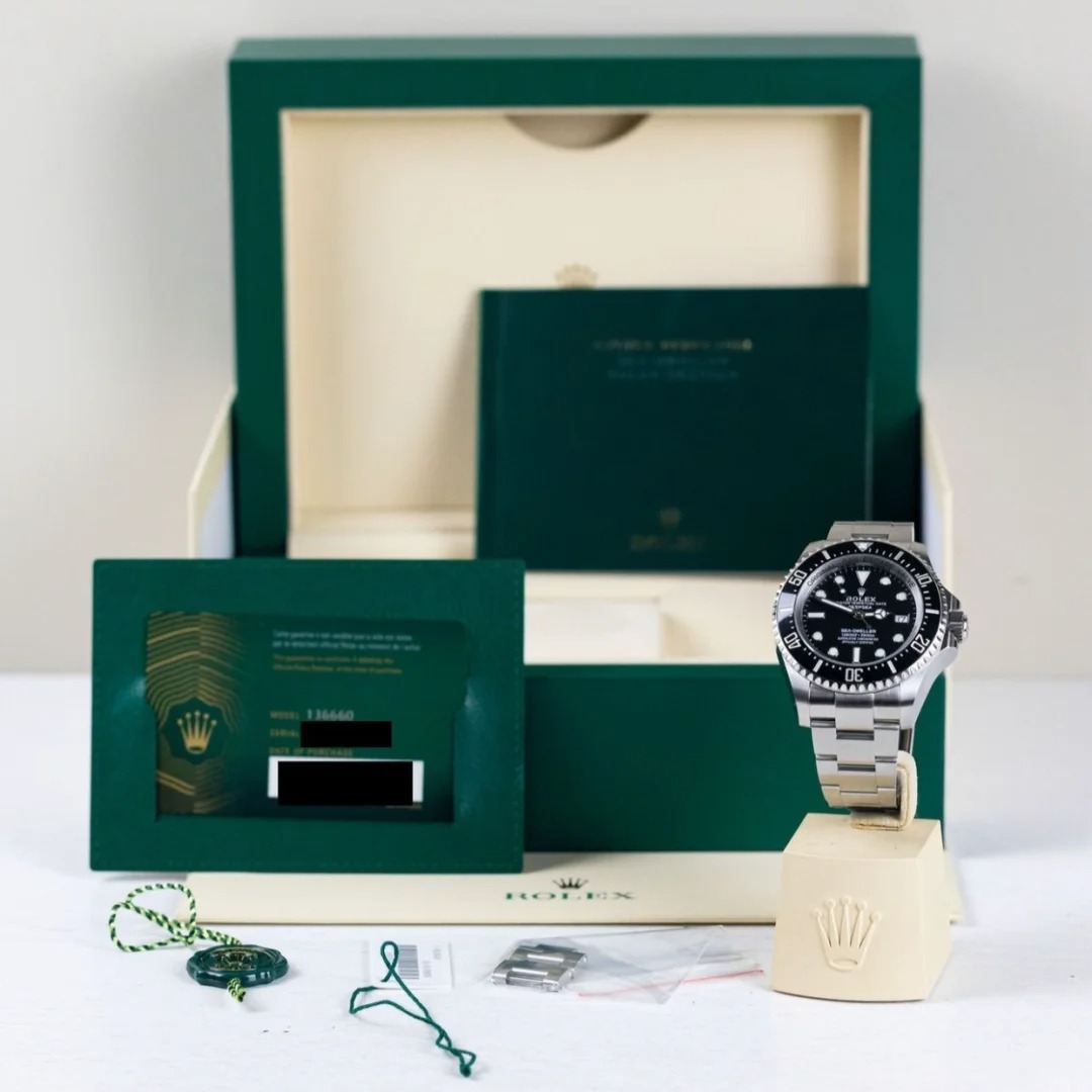 The watch is unworn and comes complete with full set of original accessories. such as watch box. warranty card dated recently. booklets and manuals.
