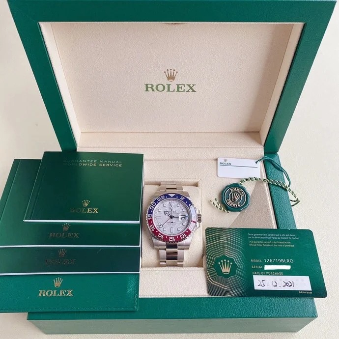 The watch is unworn and comes complete with full set of original accessories. such as watch box. warranty card dated recently. booklets and manuals.