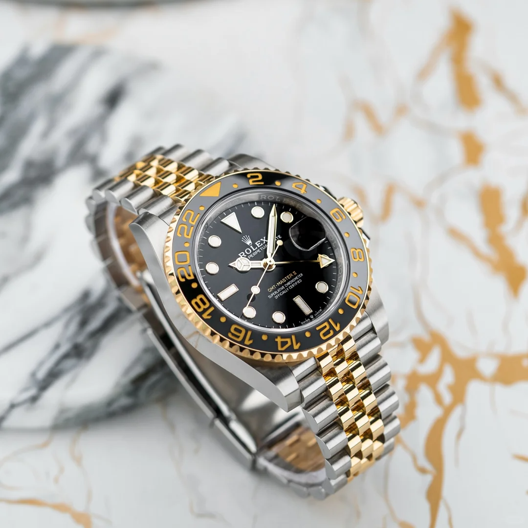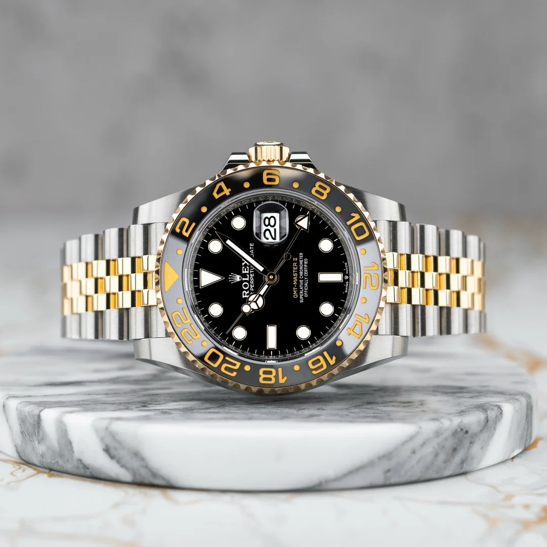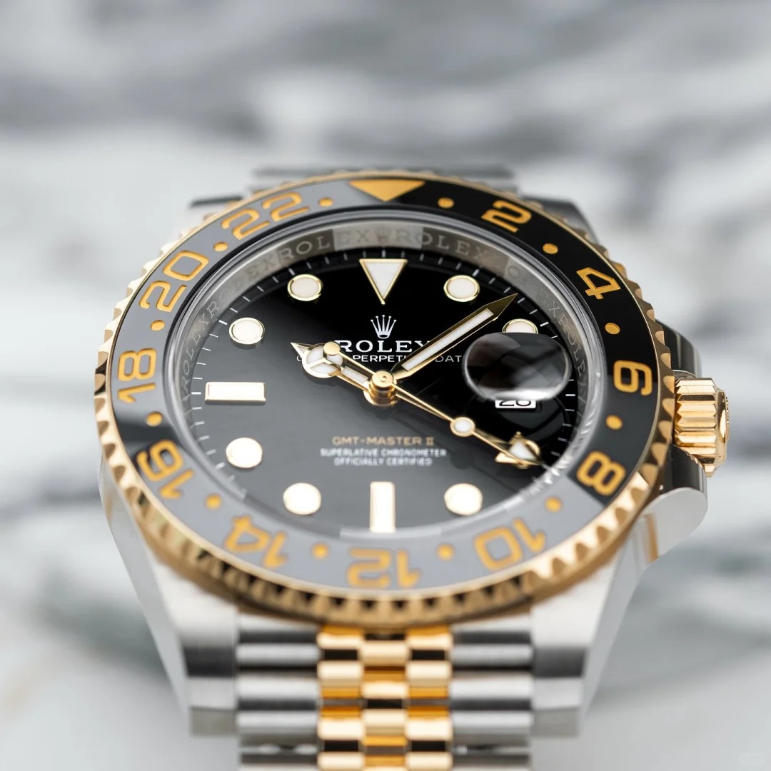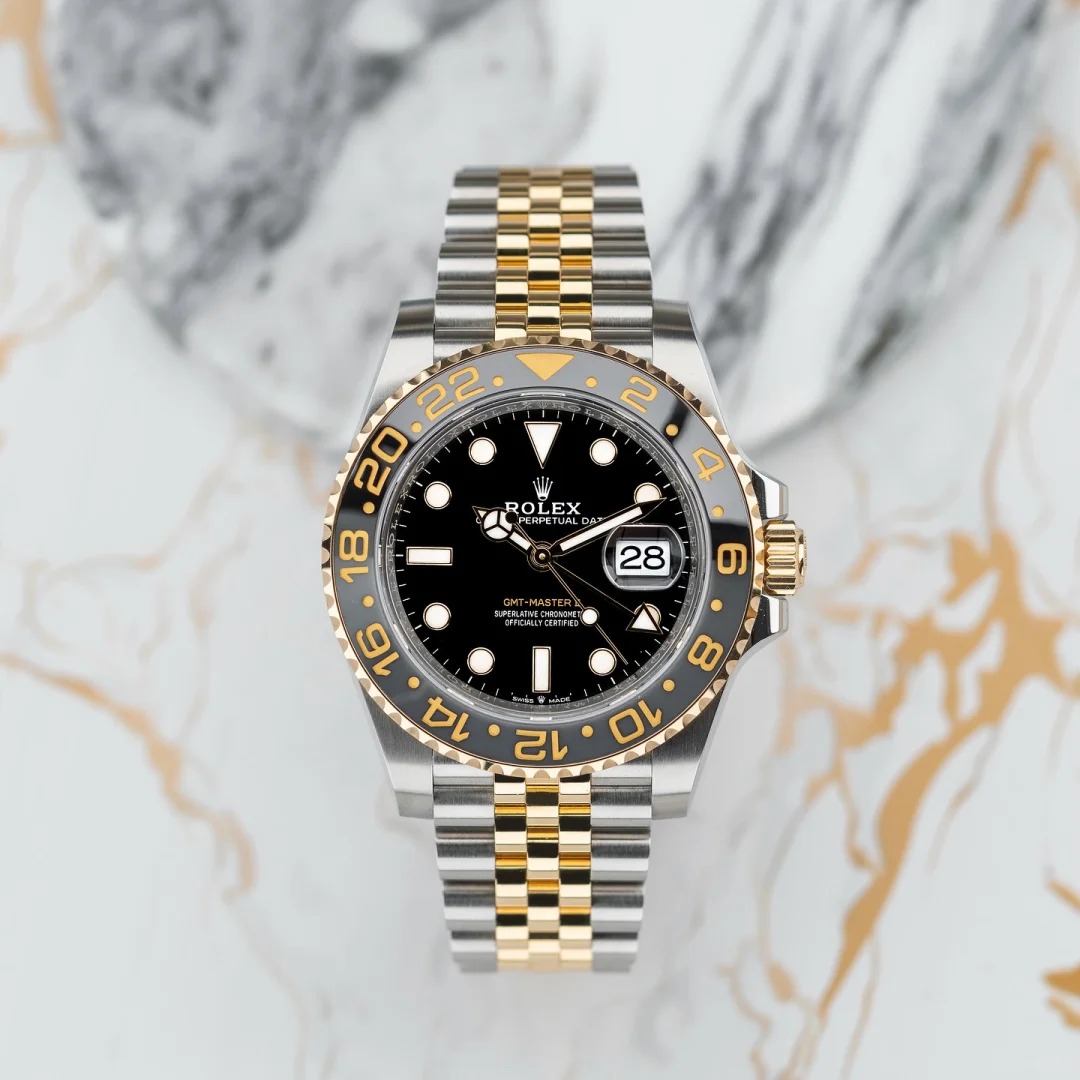 The Oyster Perpetual GMT-Master II is available in yellow gold and Oystersteel with a black dial and a Jubilee bracelet. -m126713grnr-0001 40mm
