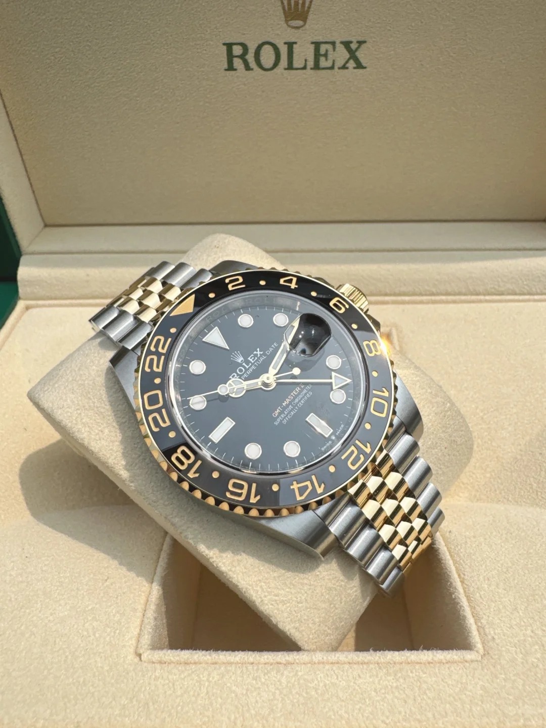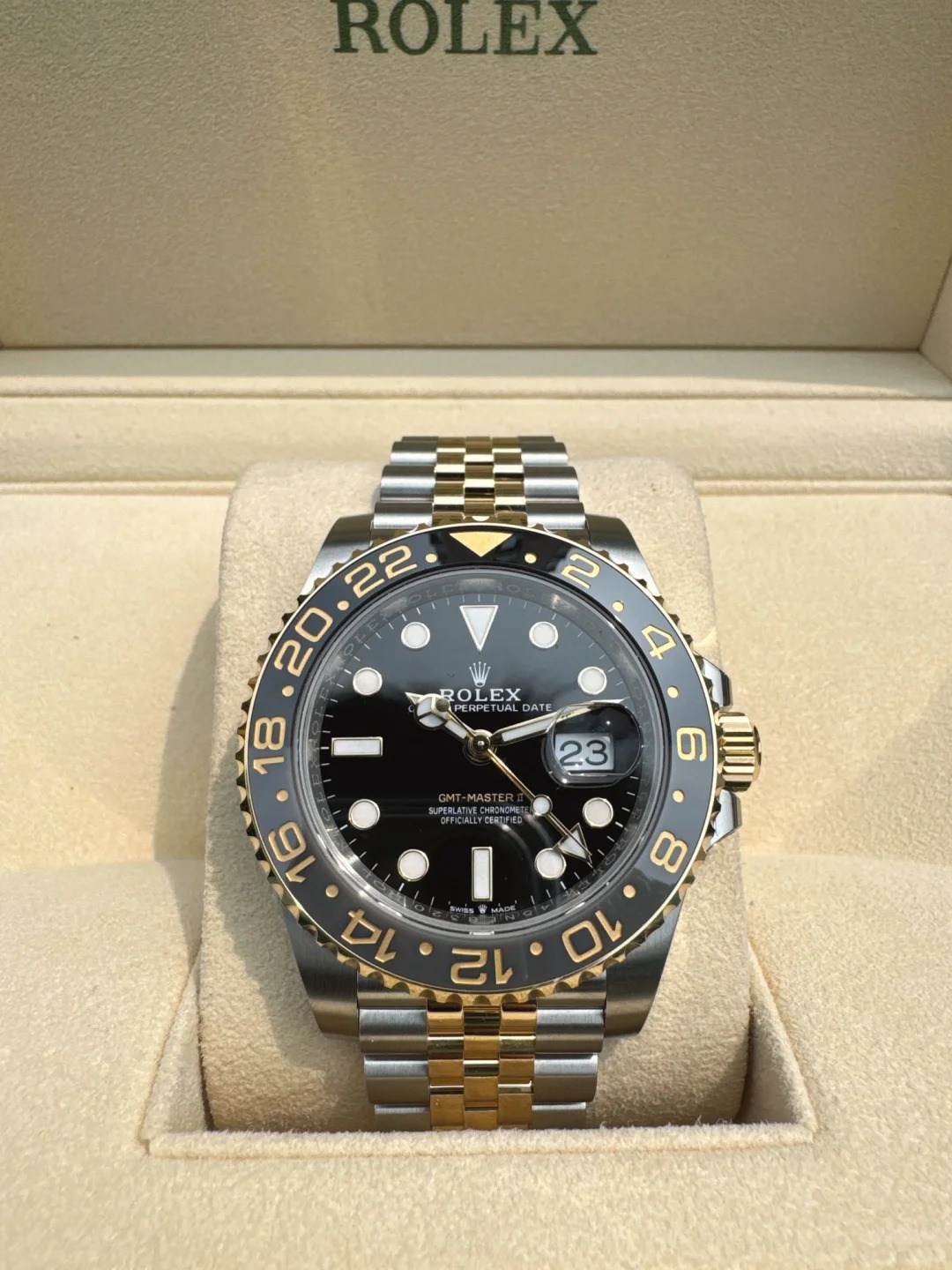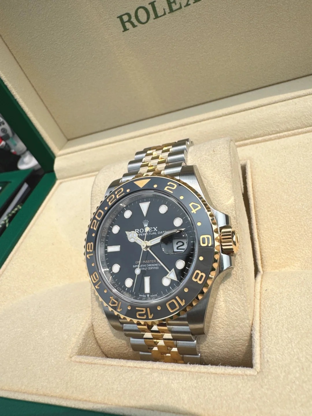 The Oyster Perpetual GMT-Master II is available in yellow gold and Oystersteel with a black dial and a Jubilee bracelet. -m126713grnr-0001 40mm